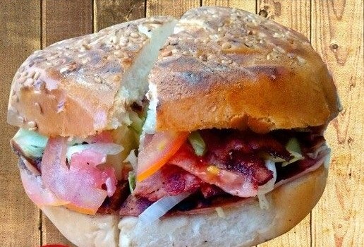 Carne arrachera, jamón, queso amarillo, tomate, cebolla y lechuga.