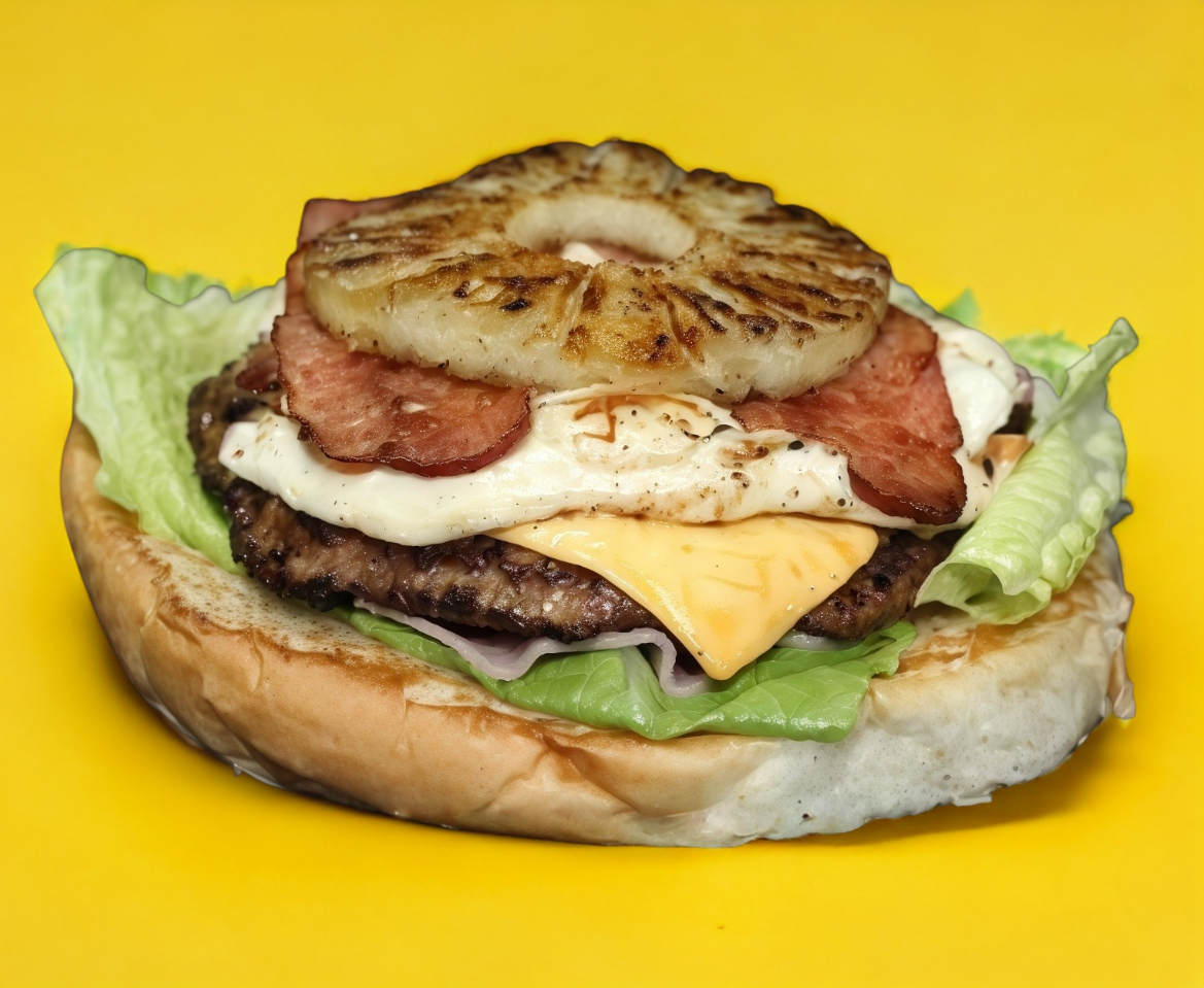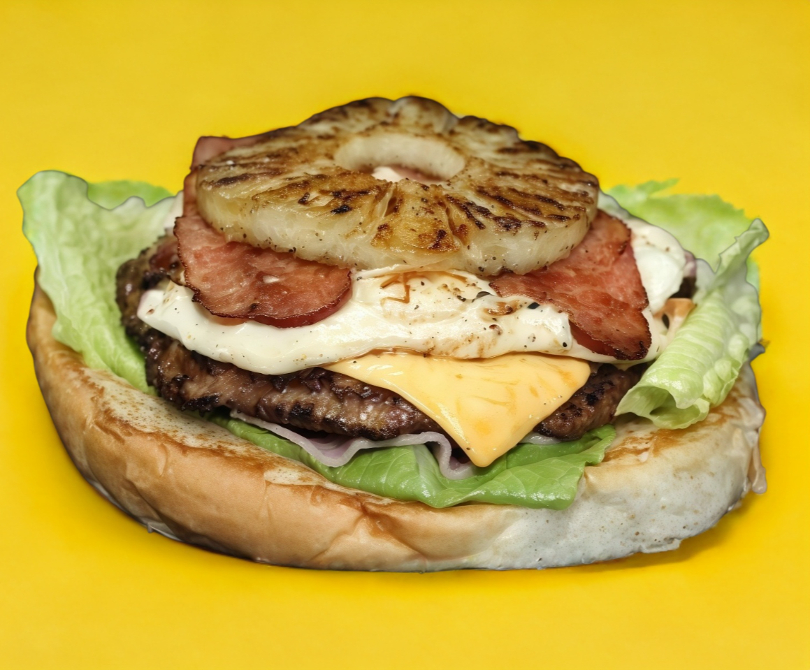 Jamón, piña, tocino, quesillo, doble carne, queso amarillo, tomate, cebolla y lechuga.