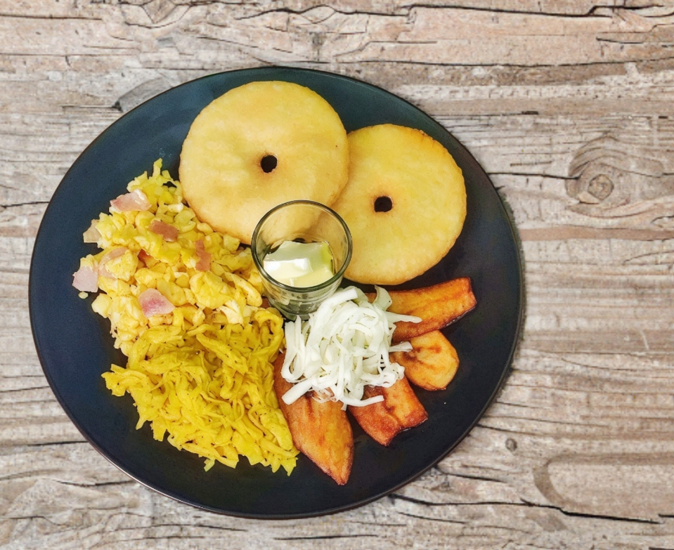 2 Arepas fritas, Huevos revueltos con jamón, Catira (Pollo guisado), Tajadas (platano frito) y Queso.