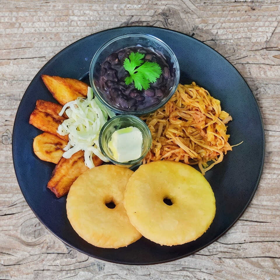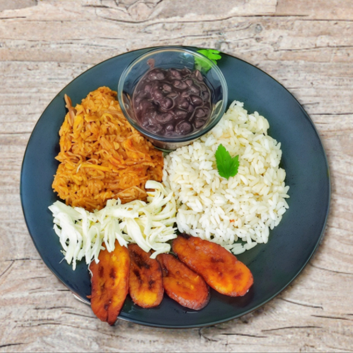 Arroz blanco, 1 Huevo frito, Carne Deshebrada, Frijoles negros, Tajadas (platano frito) y Queso.