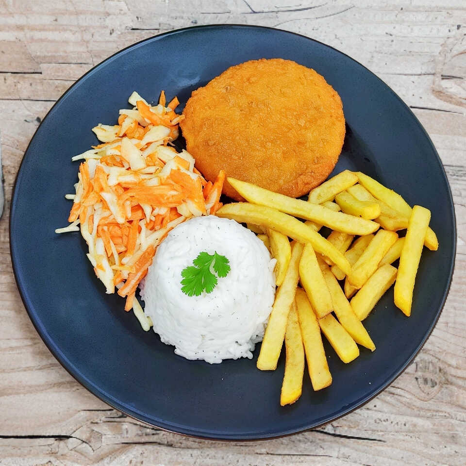 Arroz blanco, Ensalada rallada (repollo y zanahoria con aderezo), Papas Fritas, Pollo empanizado.