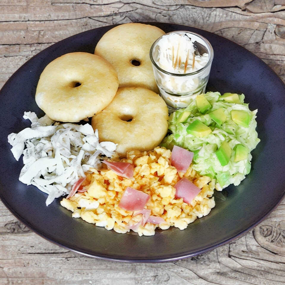 2 Arepas fritas, Huevos revueltos con jamón, Reina Pepiada (Pollo con aguacate), Tajadas (platano frito) y Queso.