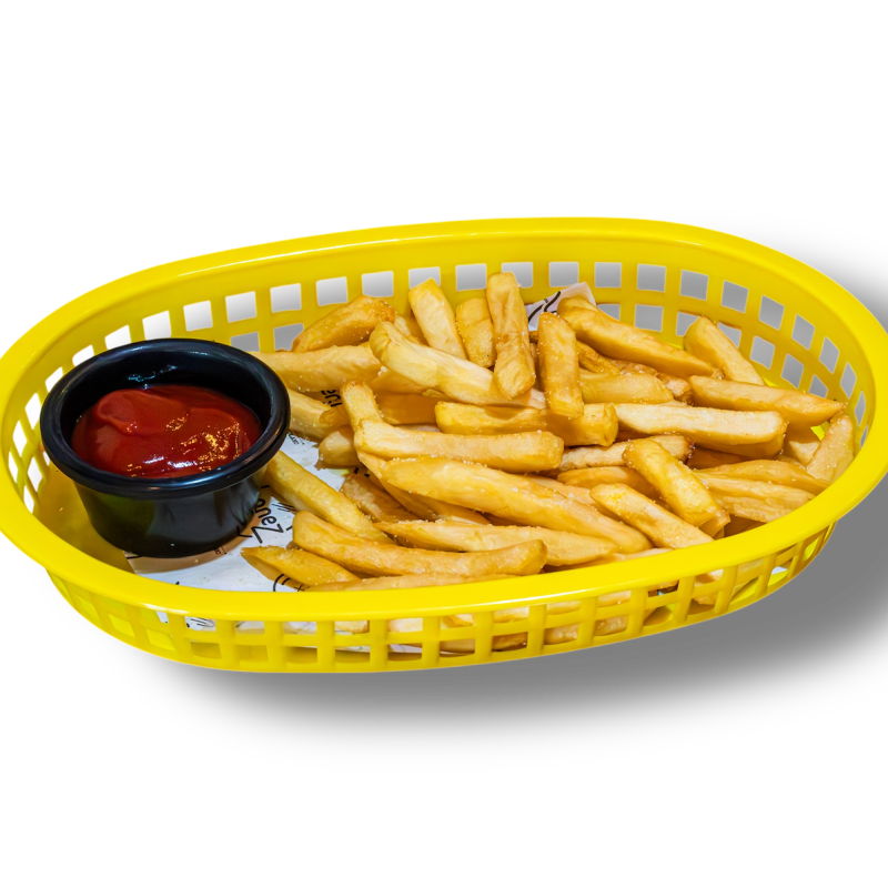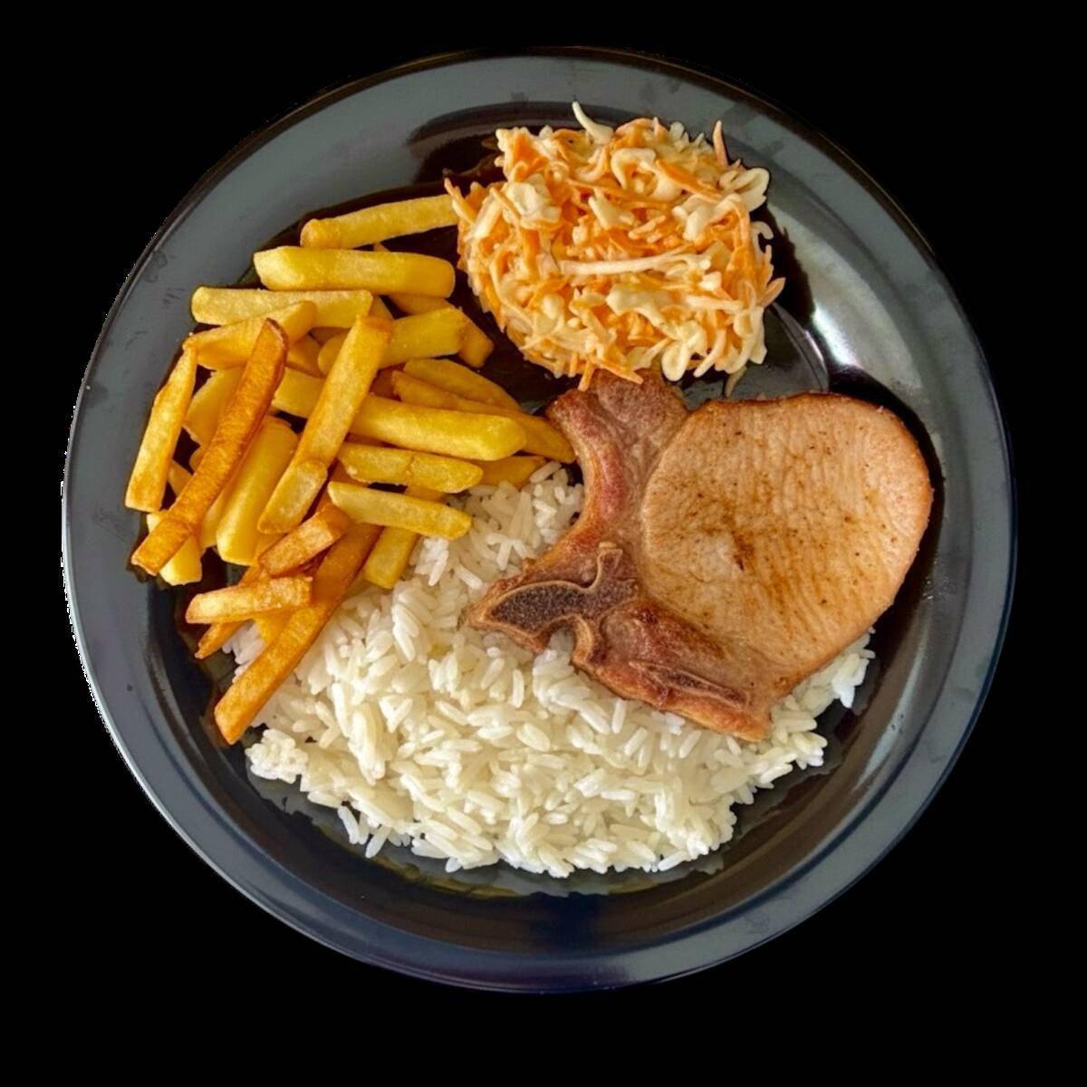 Arroz blanco, Ensalada rallada (repollo y zanahoria con aderezo), Papas Fritas, 1 Chuleta ahumada (Chuleta de cerdo).