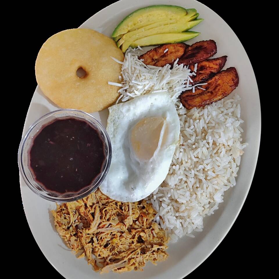 Arroz blanco, 1 Arepa frita, 1 Huevo frito, Aguacate, Carne Deshebrada, Frijoles negros, Tajadas (platano frito) y Queso.