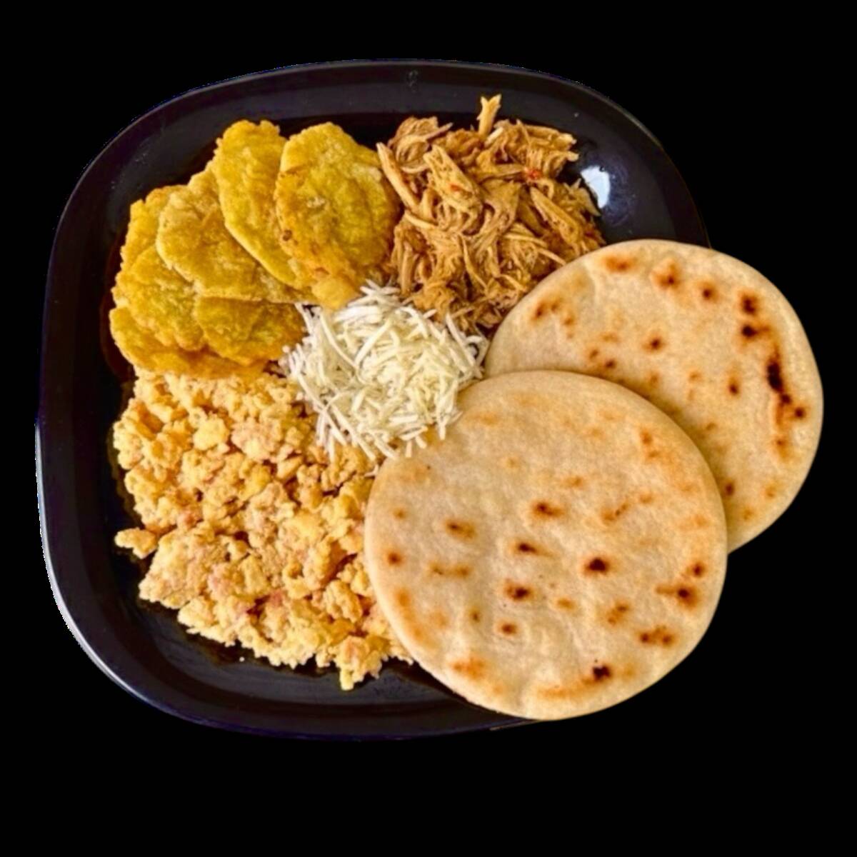 1 Arepa delgada, Huevos Perico (revueltos con tomate y cebolla), Tostones (platano verde frito), Carne deshebrada y Queso.