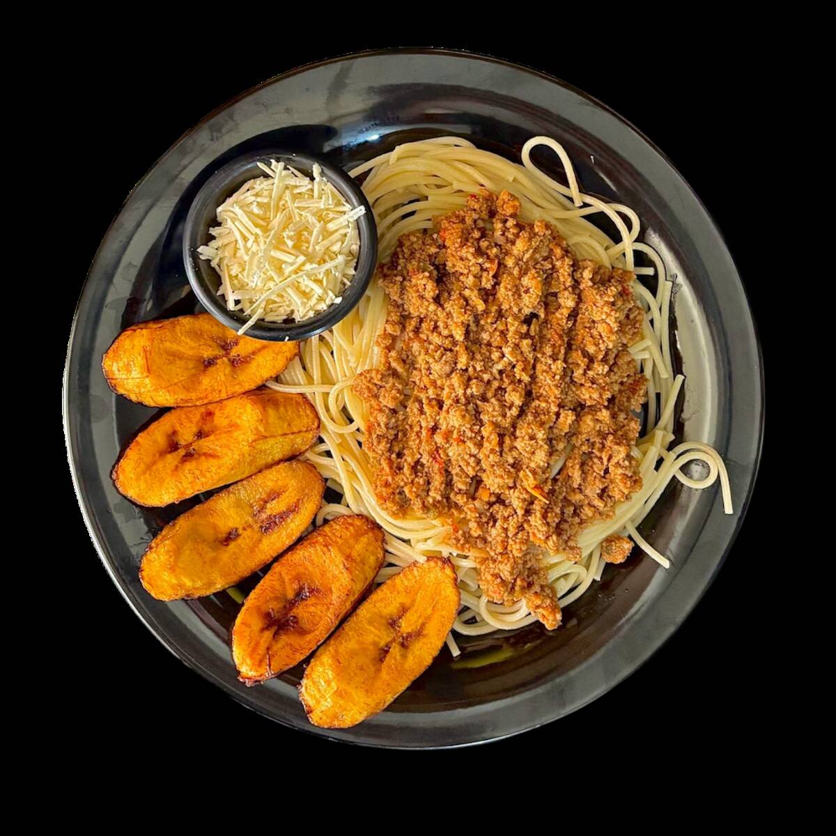 Espagueti, Carne Molida, Tajadas (platano frito), Queso rallado.