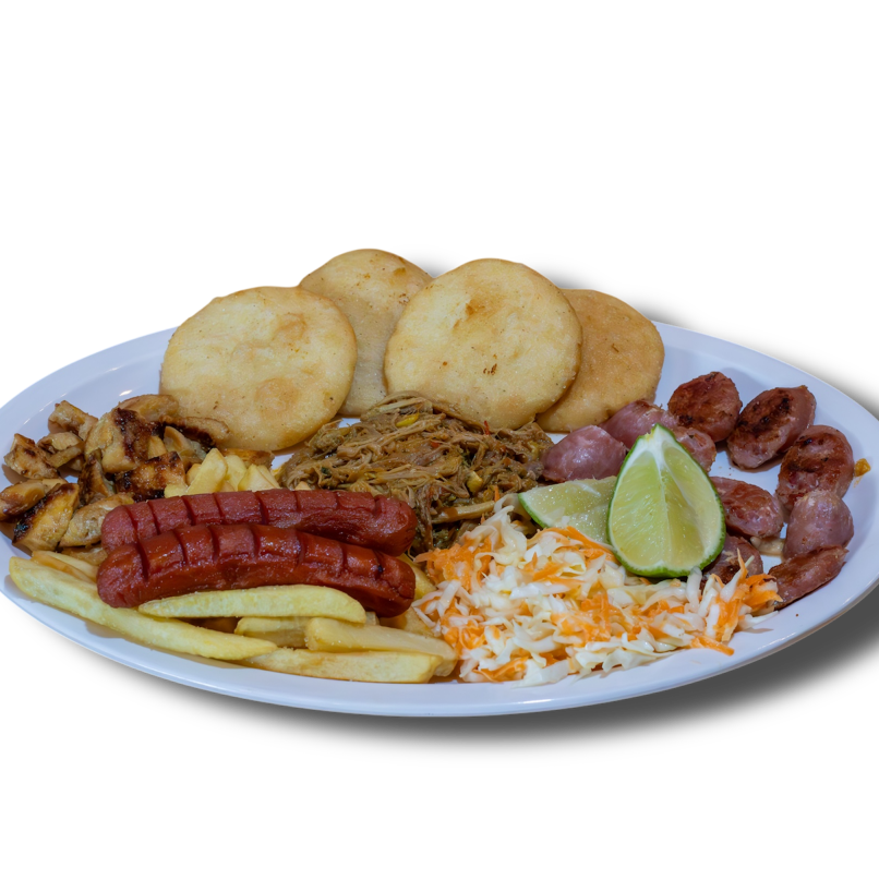 Arepitas fritas, Chorizo, Pollo a la plancha, Salchicha, Carne deshebrada, Ensalada, Papas fritas y Limón.