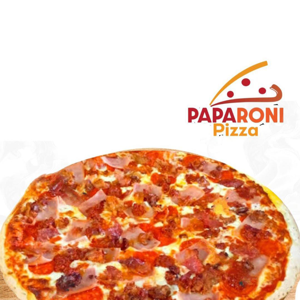 salsa base de la casa , queso mozarella , pepperoni , jamon , chorizo, tocino
