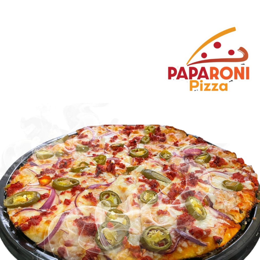 salsa base de la casa , queso mozarella , chorizo ,jalapeño , cebolla