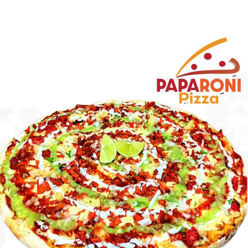 salsa base de la casa , queso mozarella , carne alpastor , piña , cebolla