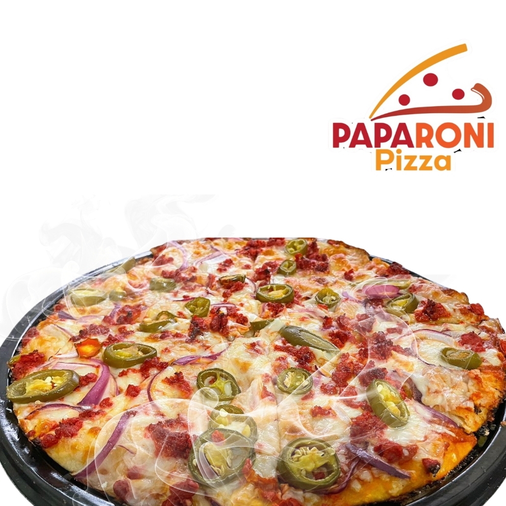 salsa base de la casa , queso mozarrella , chorizo , jalapeño , cebolla