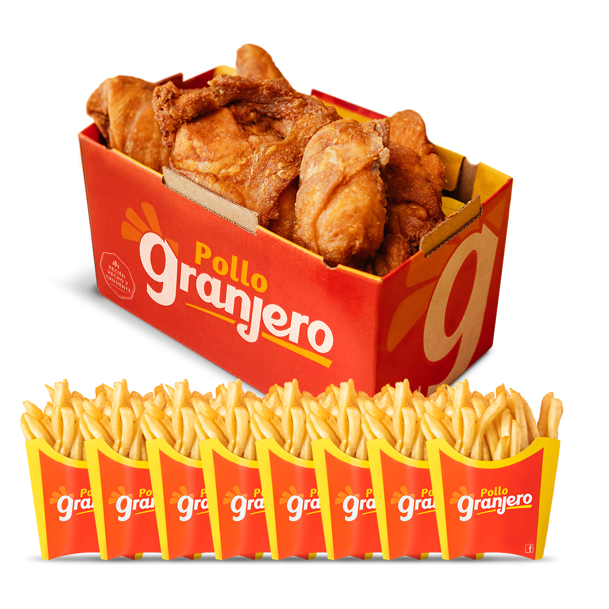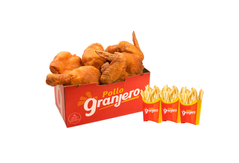 ¡Sabor granjero que se disfruta en grande!, 8 piezas de pollo tradicional 4 papas fritas.