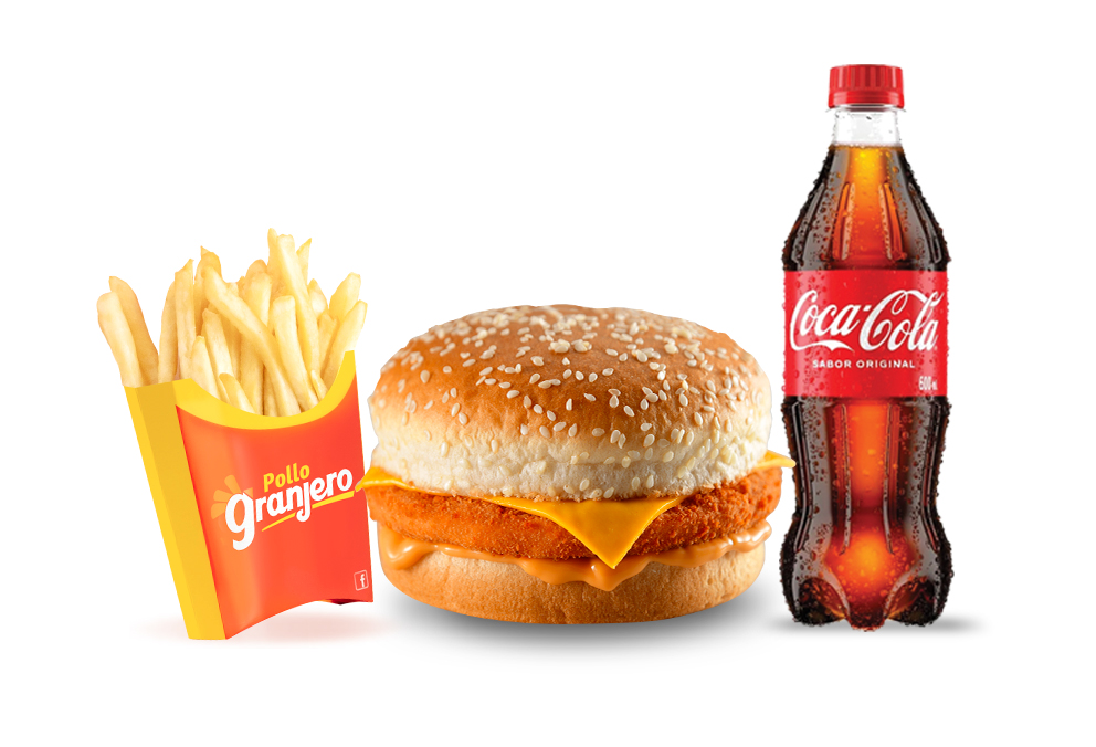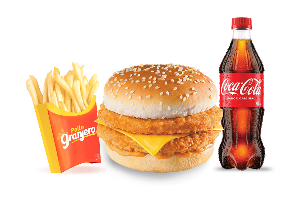 Hamburguesa con doble filete de pollo empanizado, doradito y crujiente, con queso derretido, en un pan suave. Acompañado de papas doraditas y bebida.
