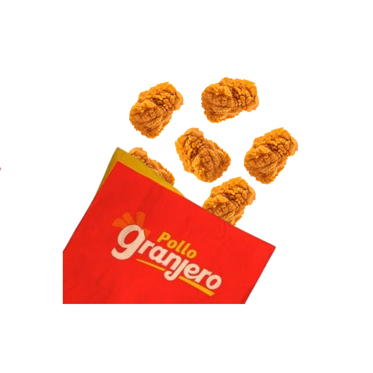 ¡Crujientes por fuera, suaves y jugositos por dentro!, Disfruta una orden de 6 granjeritos, trocitos de pura pechuga de pollo, empanizados y doraditos al punto perfecto; acompañados de 1 papa frita.