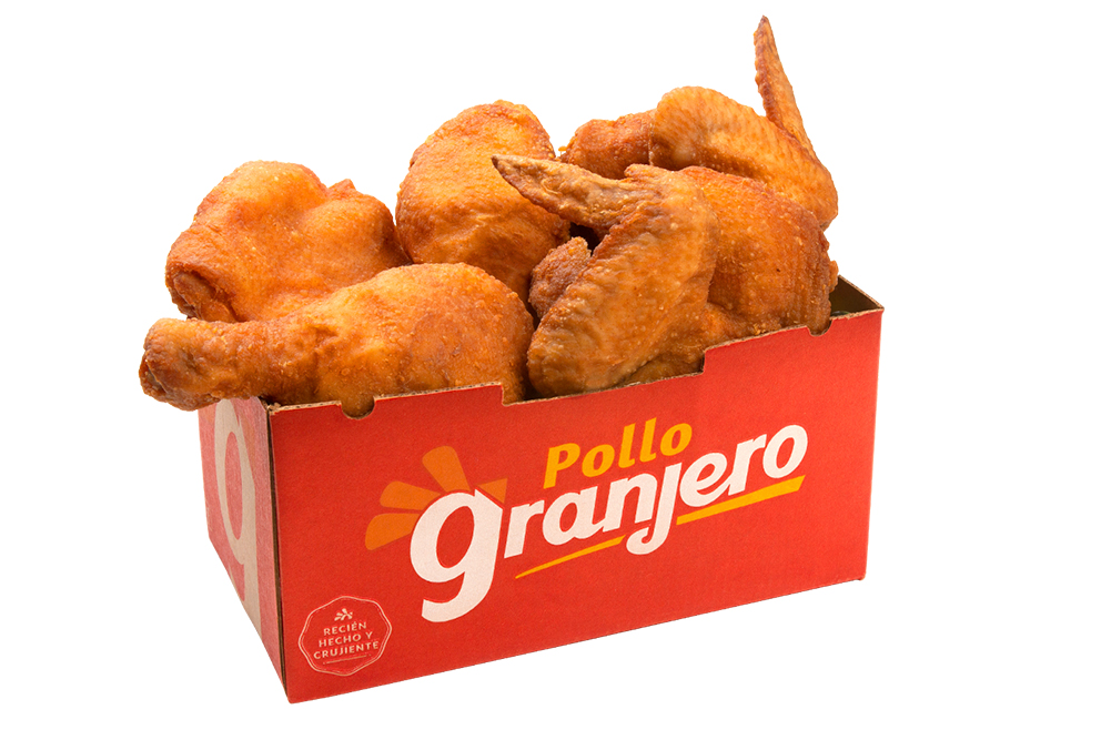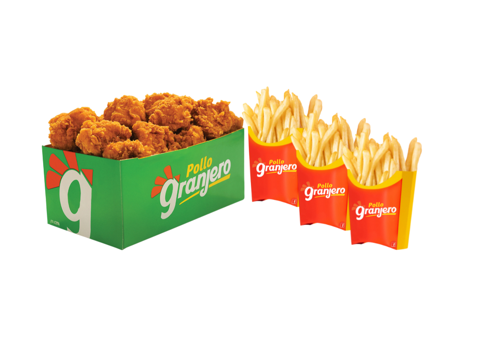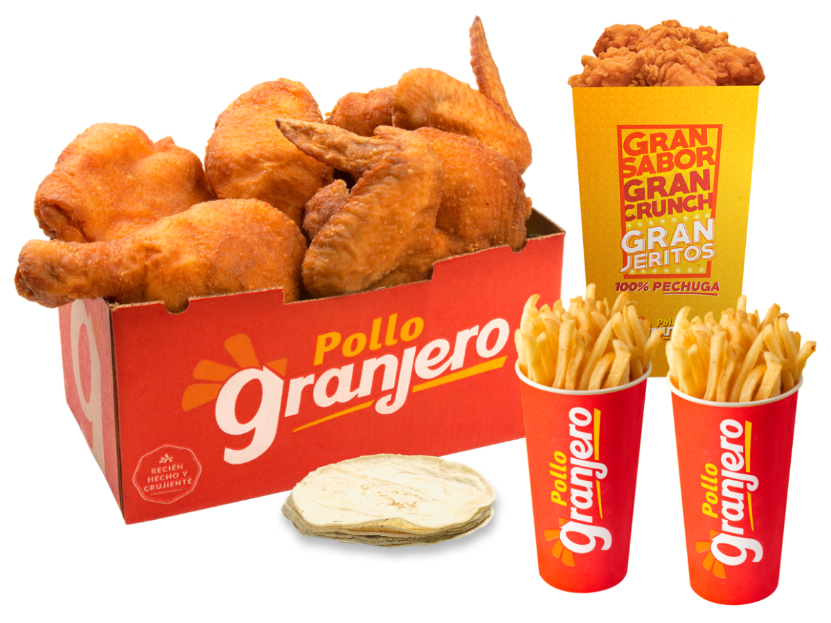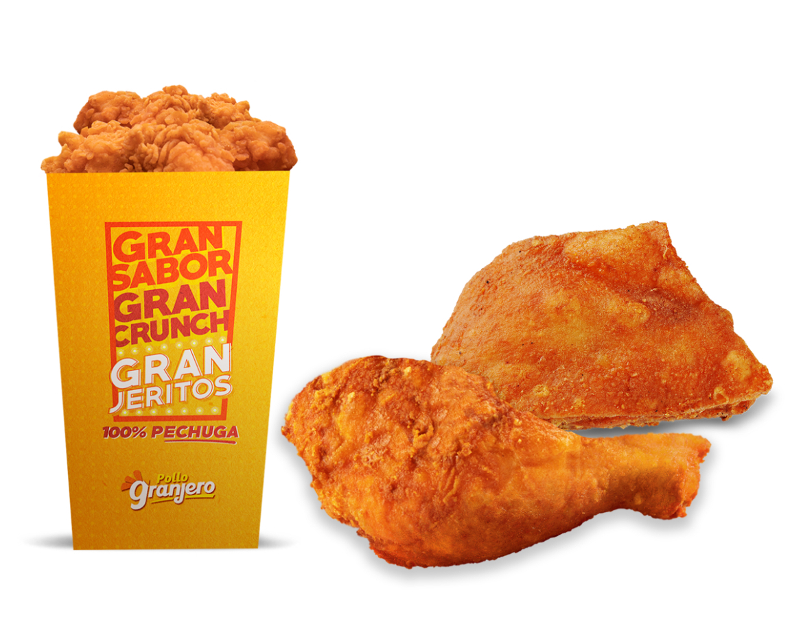 ¡Sabor Granjero que se disfruta en grande! Disfruta 8 piezas 4 piezas de pollo frito tradicional, 1 orden de 6 granjeritos, 1 papa familiar y tortillas