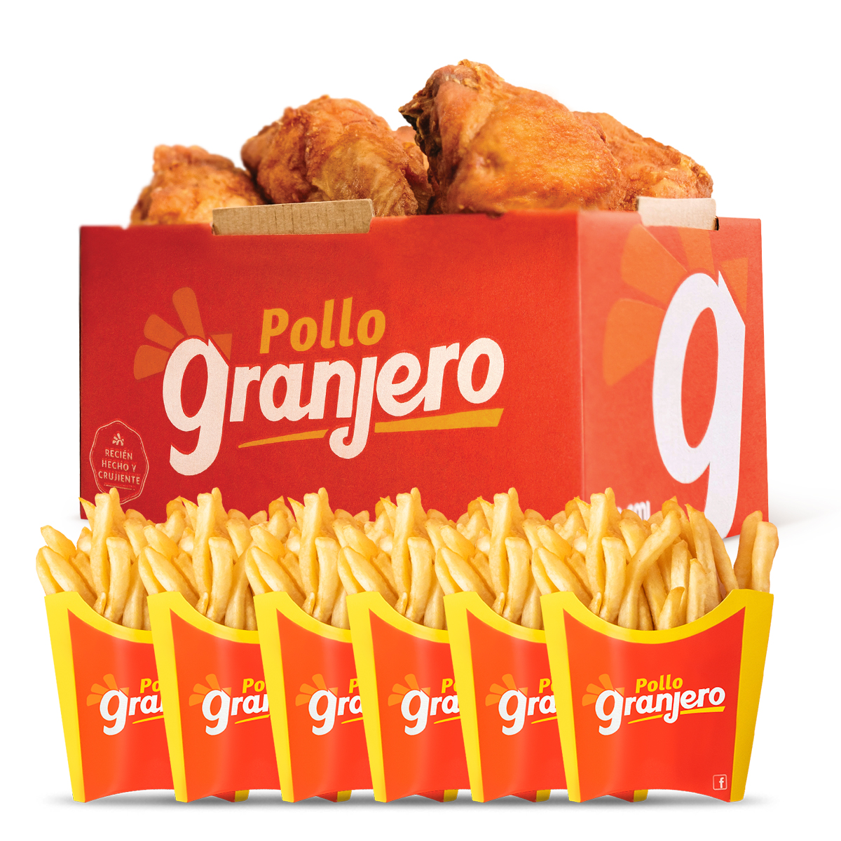 ¡Sabor granjero que se disfruta en grande!, 6 piezas de pollo frito tradicional y 3 papas fritas.