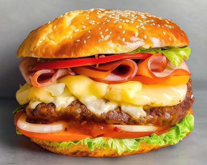 Hamburguesa con piña, jamón, queso y carne jugosa.