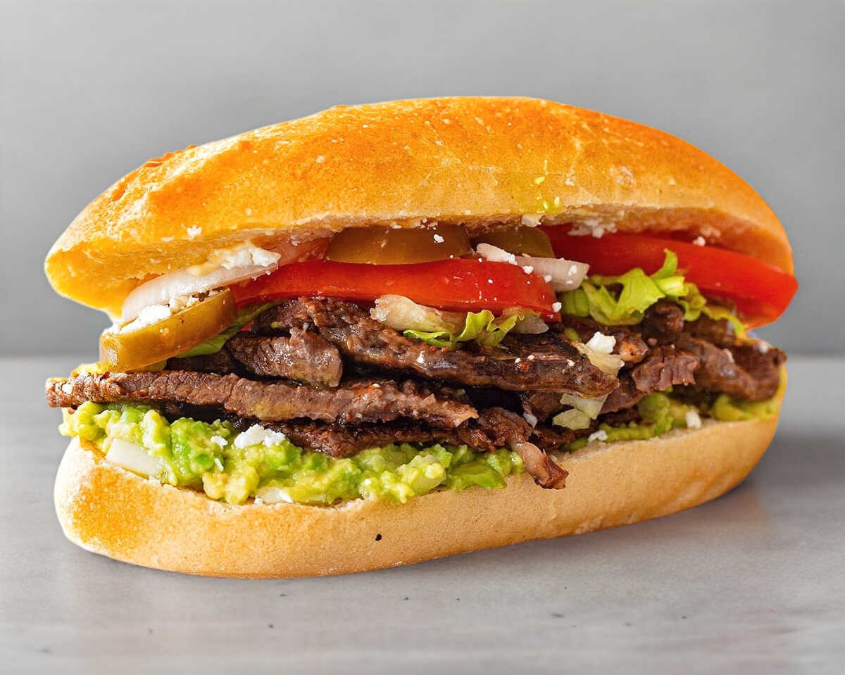 Torta rellena de carne asada, Frijol, Mayonesa y Vegetales Frescos.