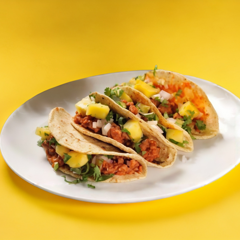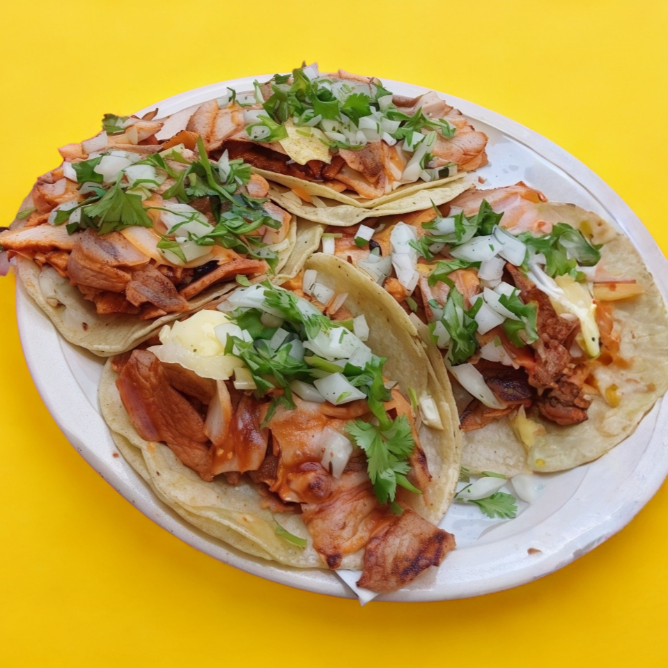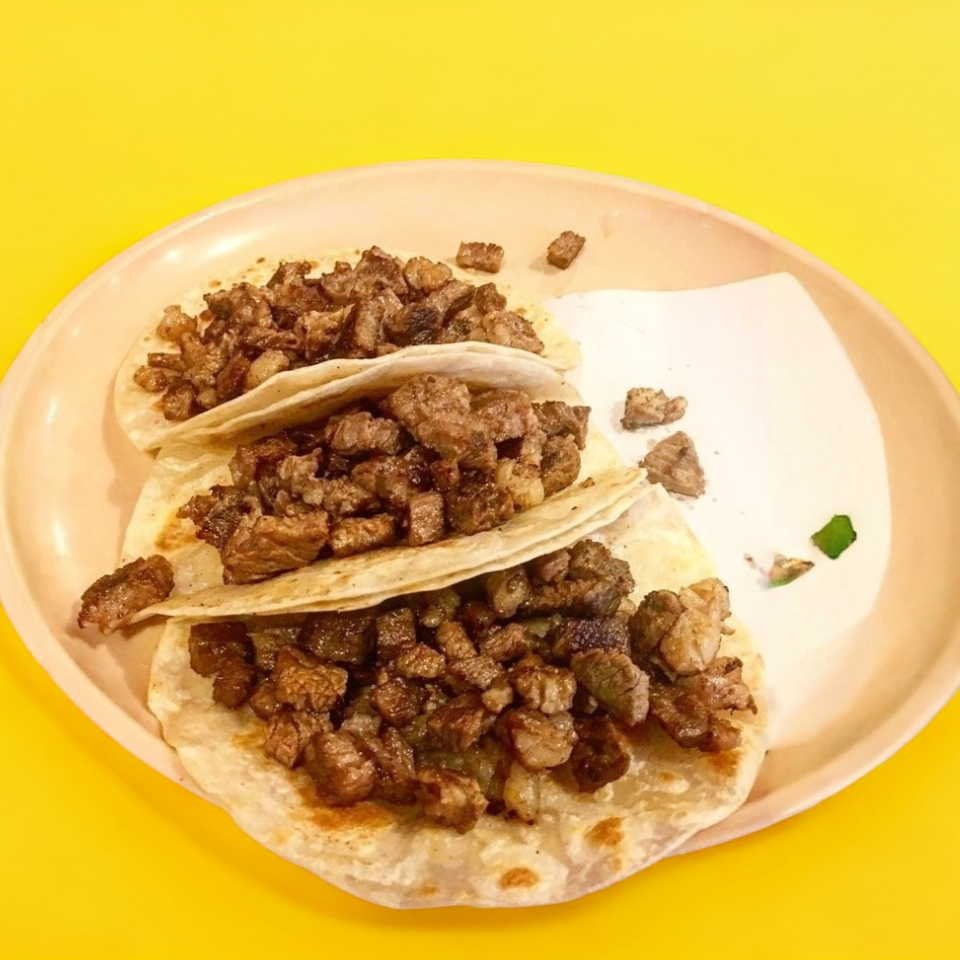 Delicioso taco con proteína, salsas, cebolla, cilantro y si deseas puedes agregar queso.