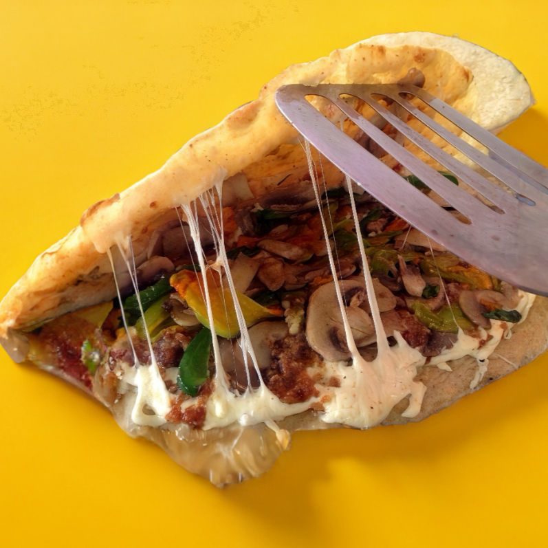 2 Tacos en tortillas de harina con champiñón, gratinado con quesillo, acompañado de sus respectivas salsitas verde y roja.