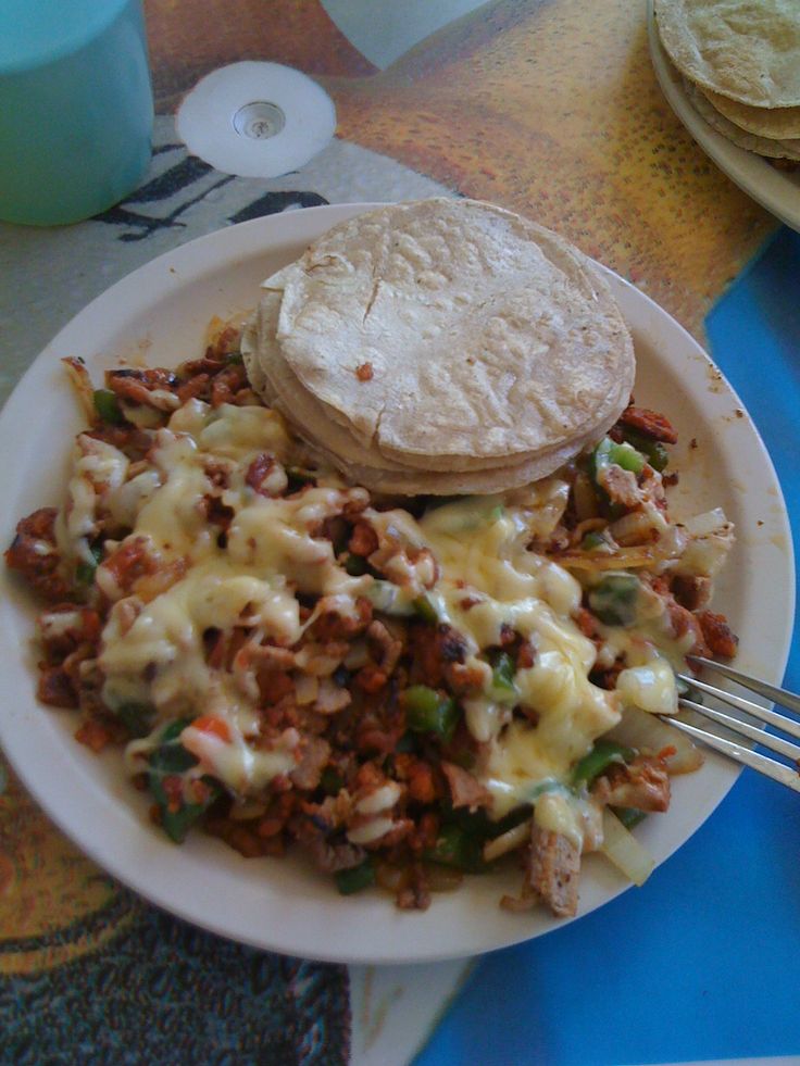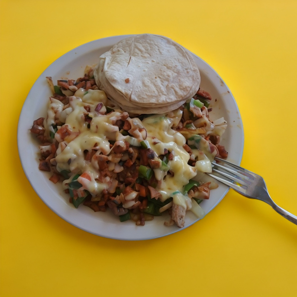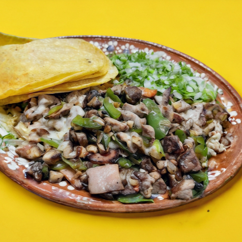 Combinación de cebolla, morrón, jamón gratinado con quesillo, acompañado de tortillas con sus dos respectivas salsas (verde y roja) y limón.