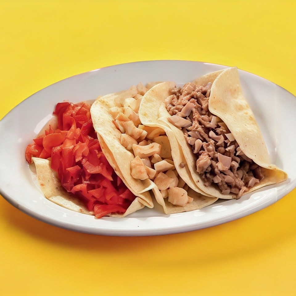 2Tacos en tortillas de harina con la carne, gratinado con quesillo, acompañado de sus respectivas salsitas verde y roja.