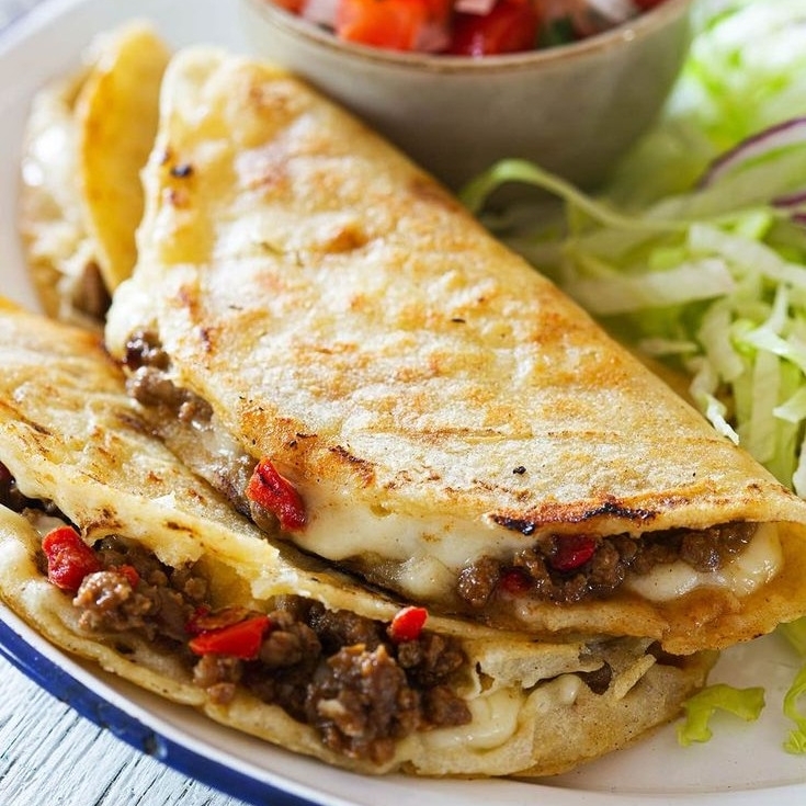 Dos tortillas de harina acompañado de carne, tu carne que elijas, gratinado con quesillo y sus respectivas salsas verde y roja.