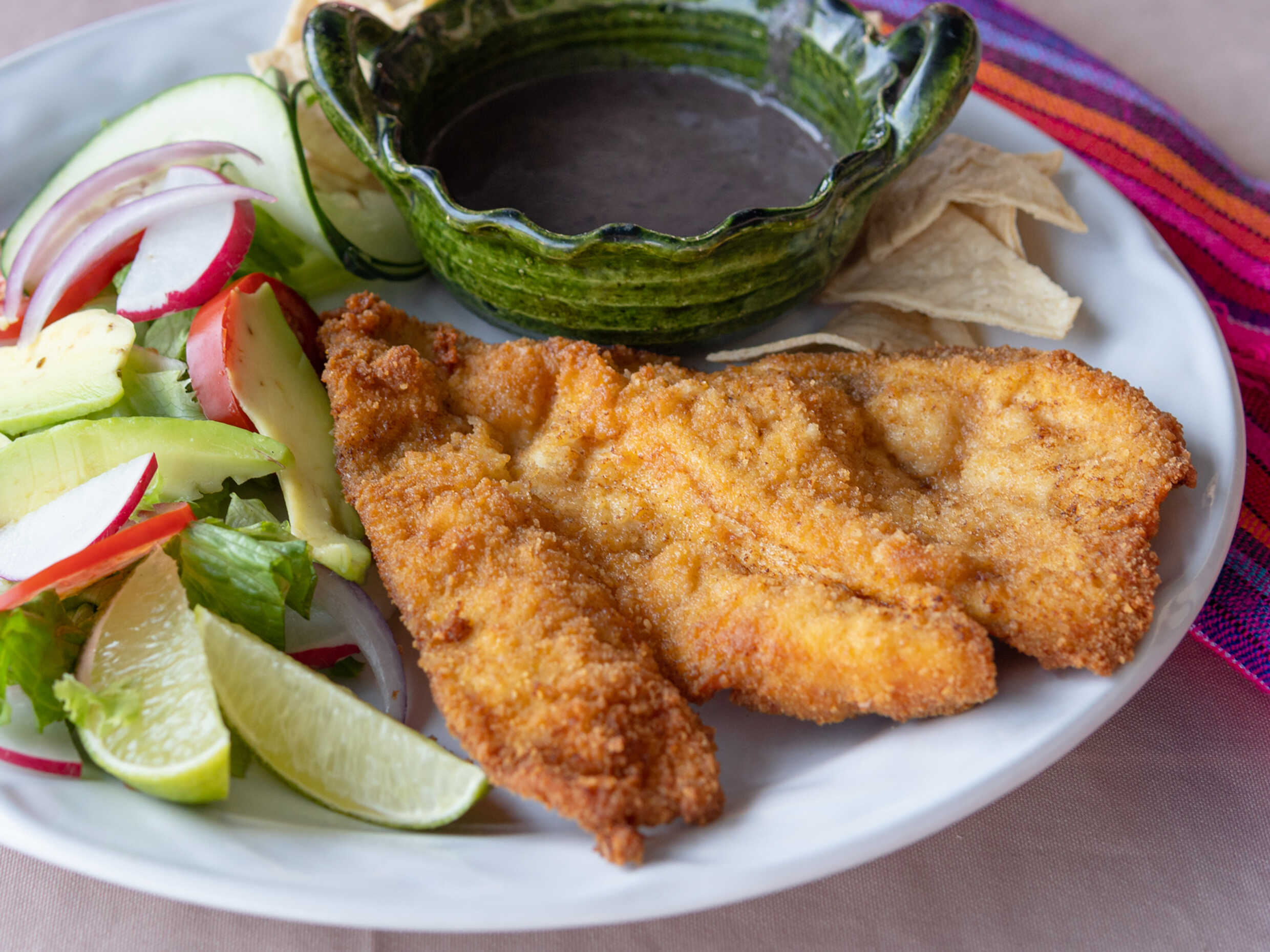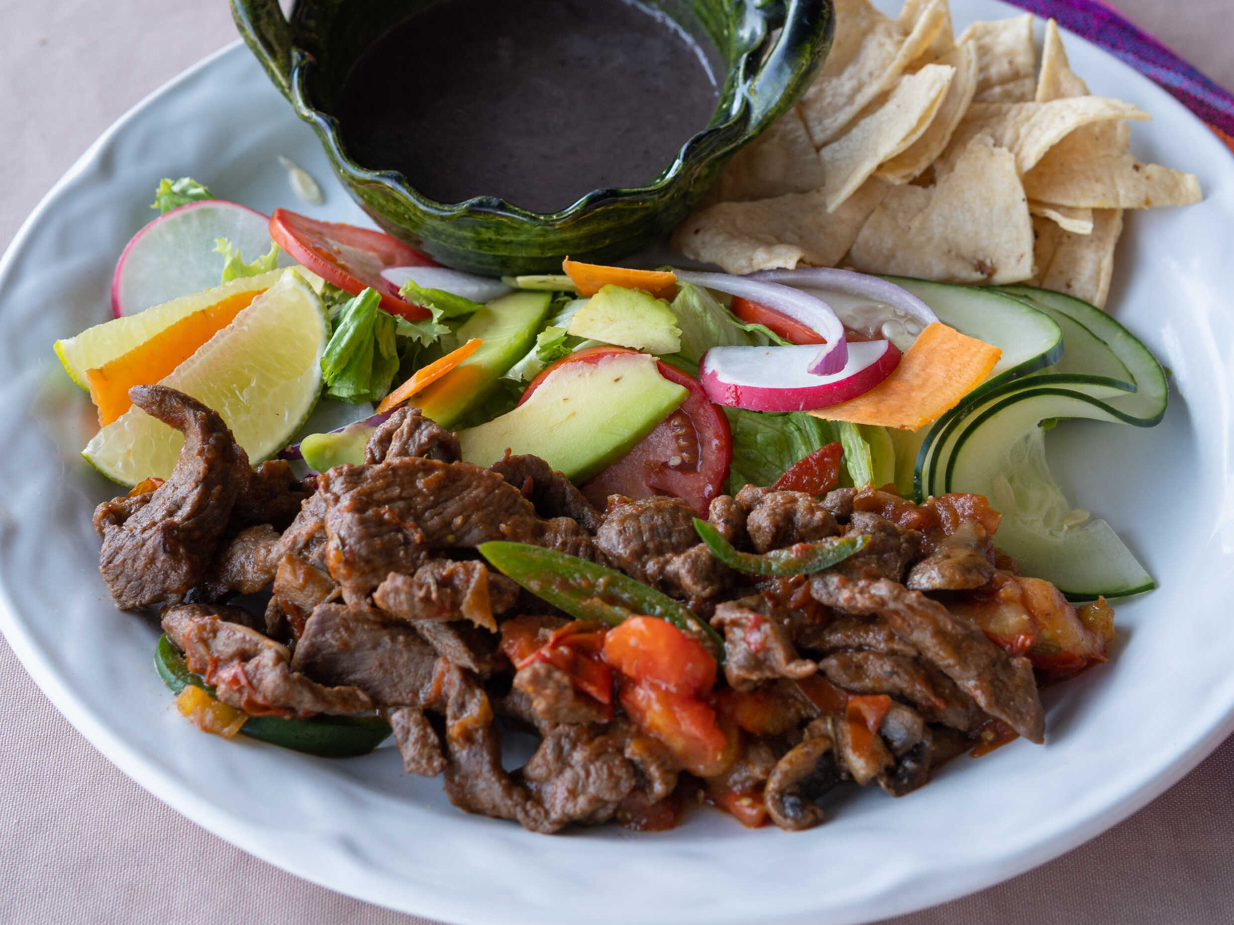 tiras de Costilla de res, ensalada, guacamole y totopos y tortilla hechas a mano