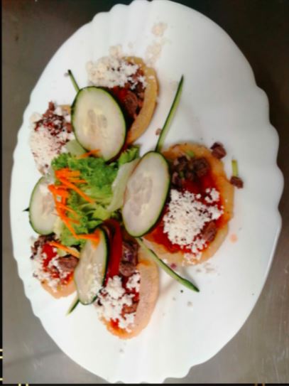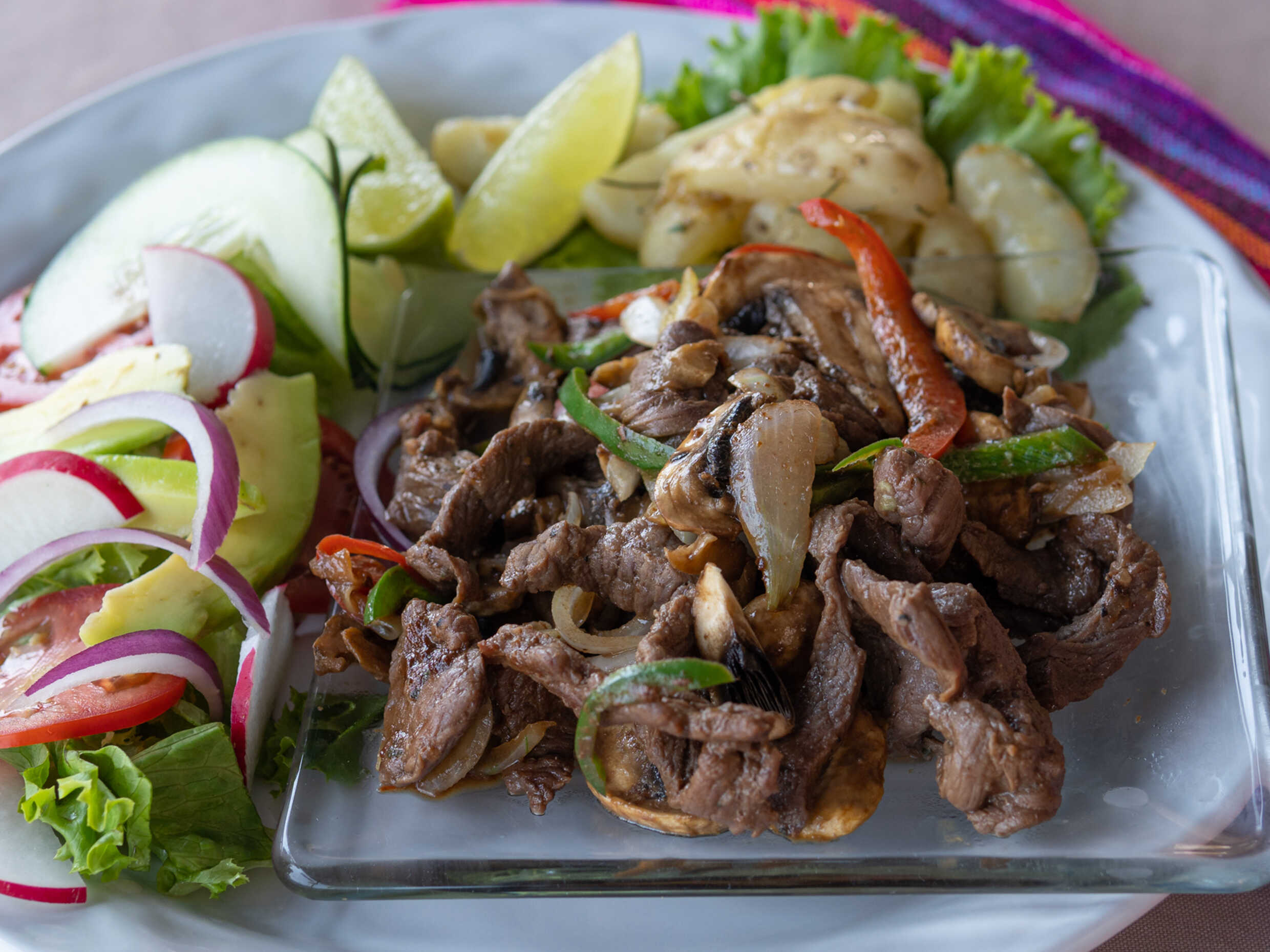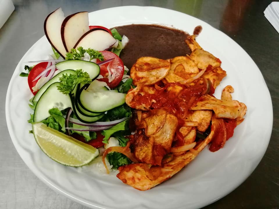fajitas de pollo con chile pimiento cebolla y quesillo gratinado ensalada pure de papas