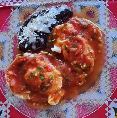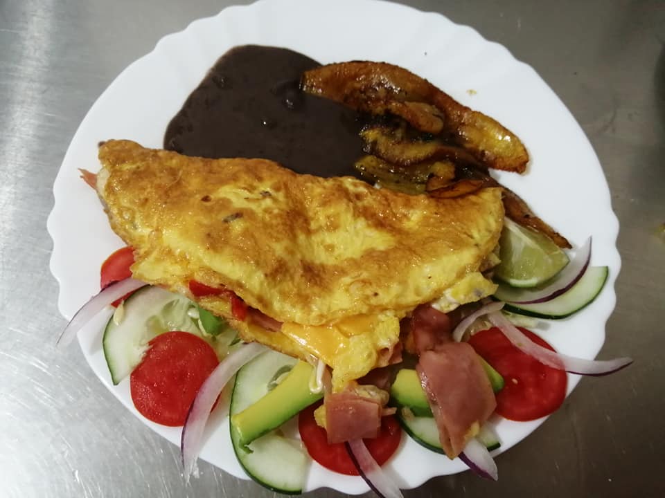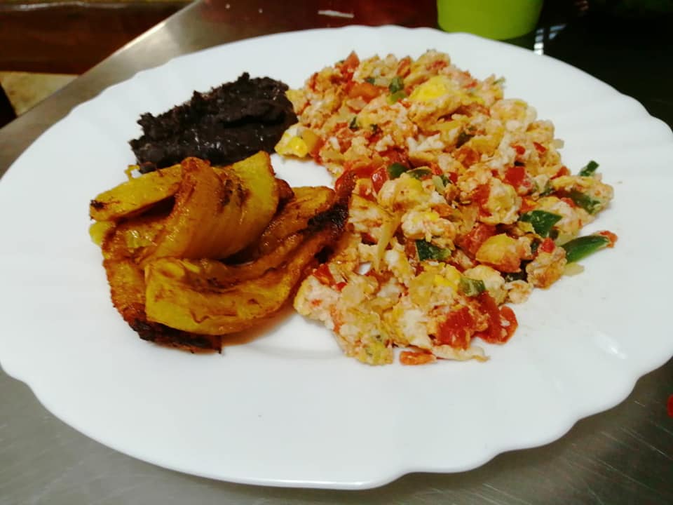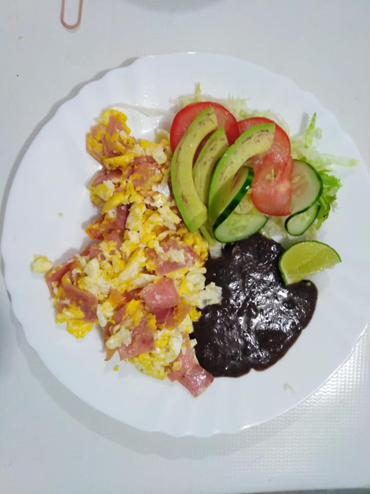 2 huevos, frijoles, plátano frito, queso crema. Tortillas y salsa verde de aguacate