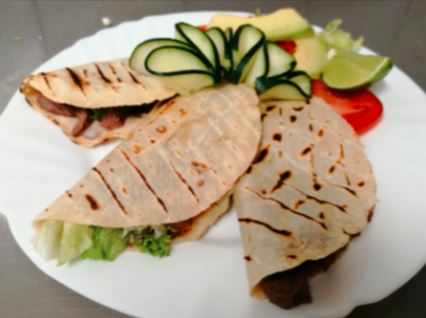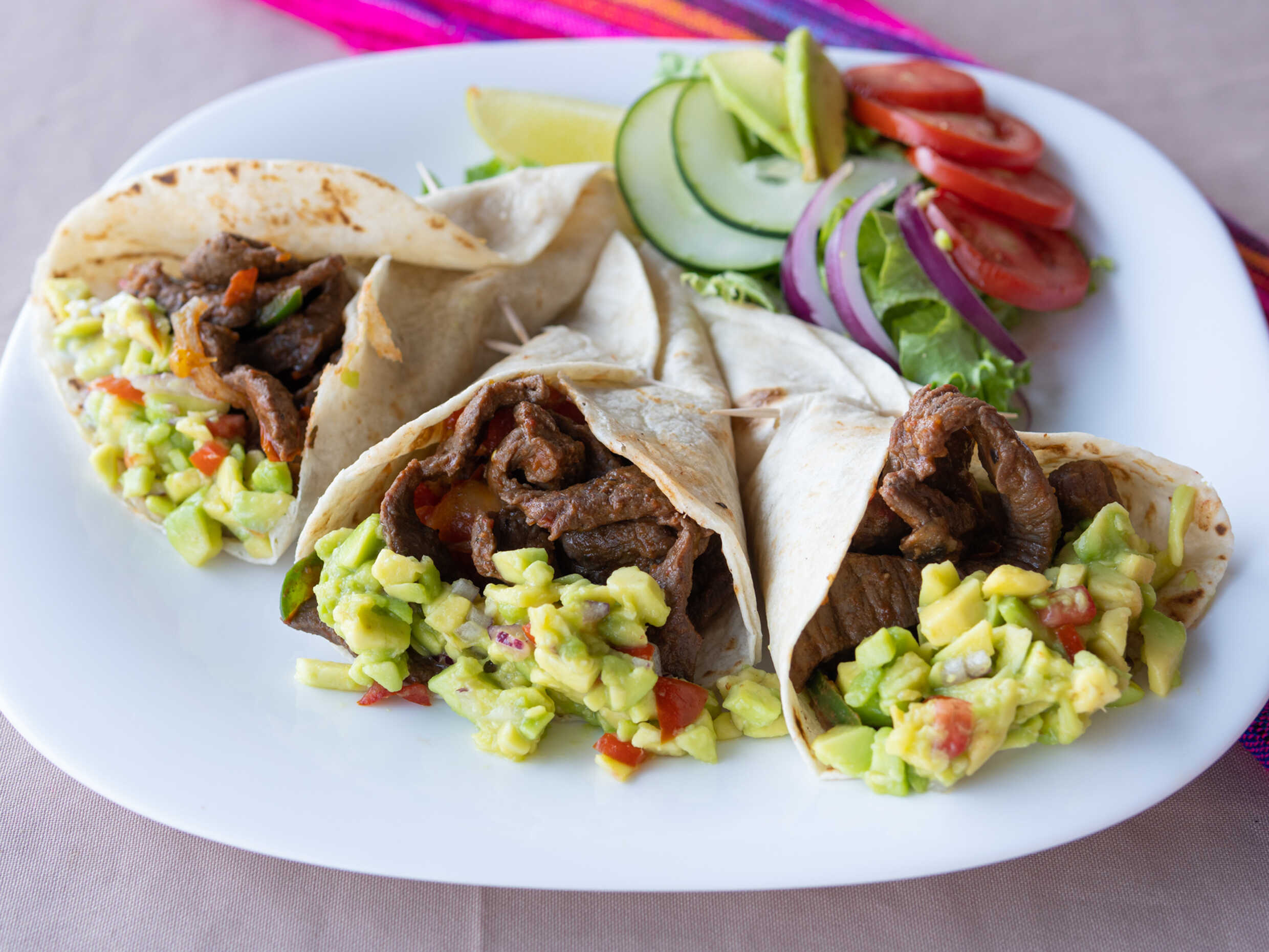 Tres tortillas de harina rellenas de carne asada quesillo, frijol, pico de gallo con aguacate.