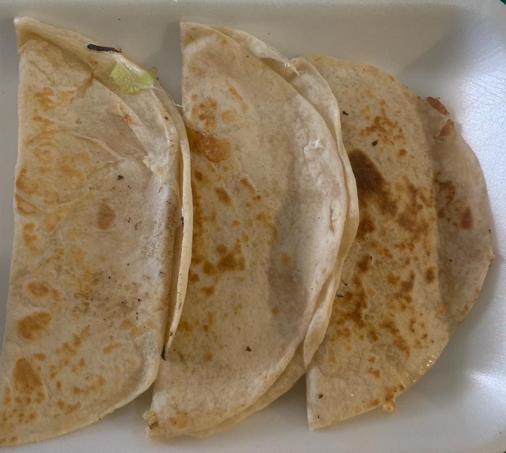 Disfruta de 3 quesadillas (solo quesillo) de tortilla de harina tamaño tortillina, acompañas de pico de gallo y salsa verde.