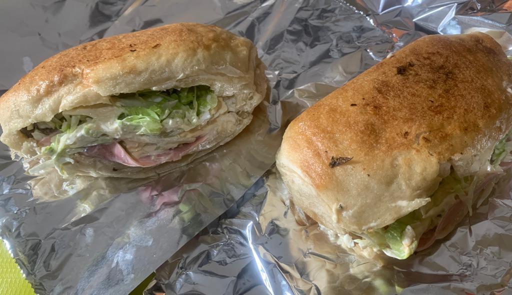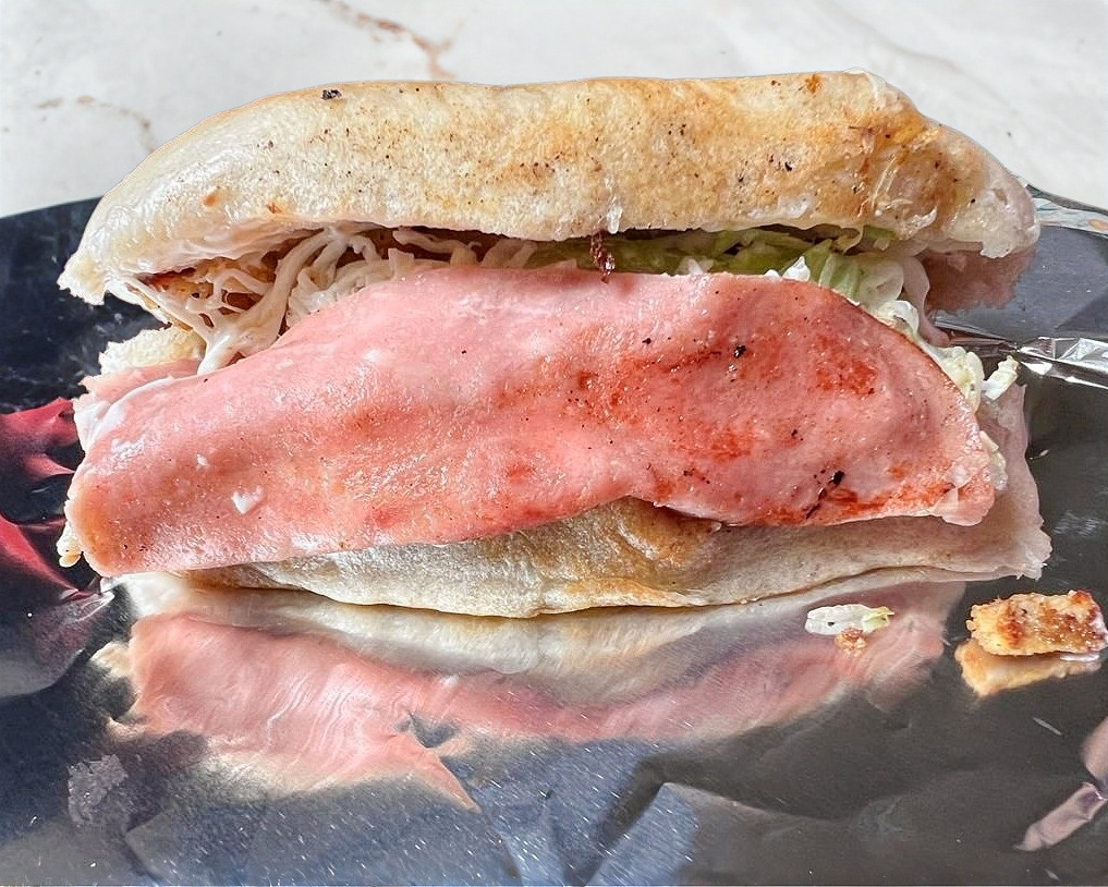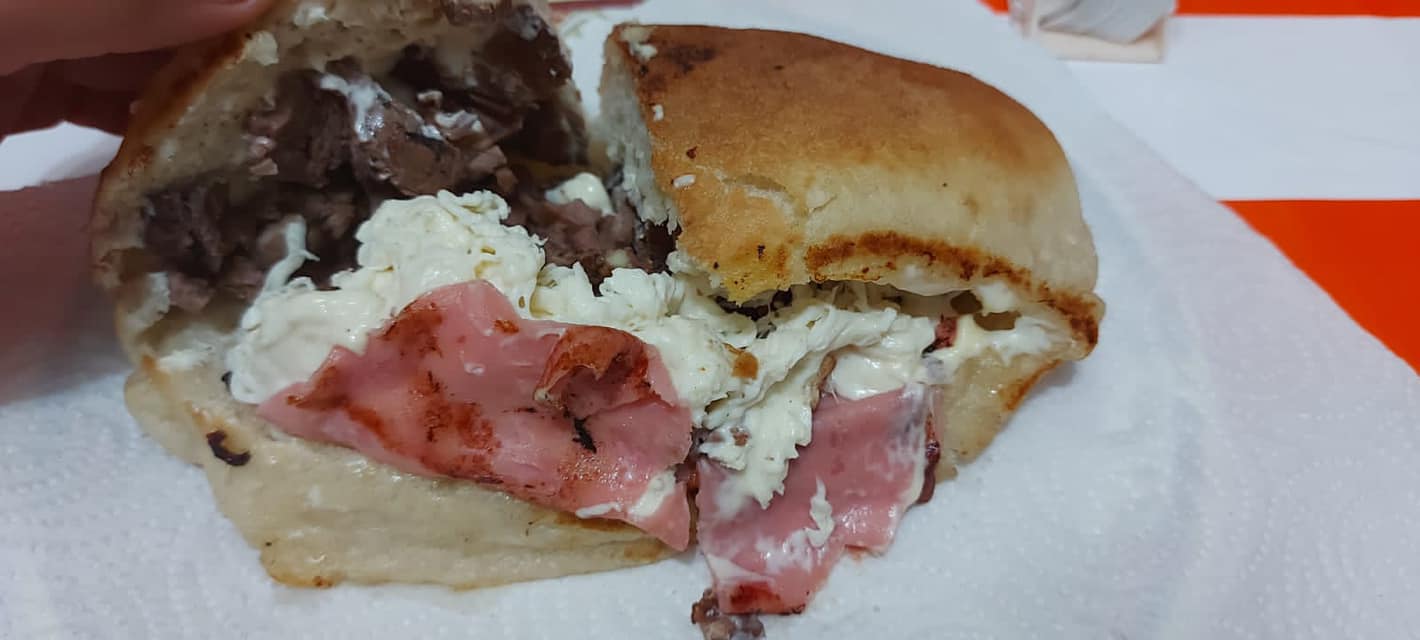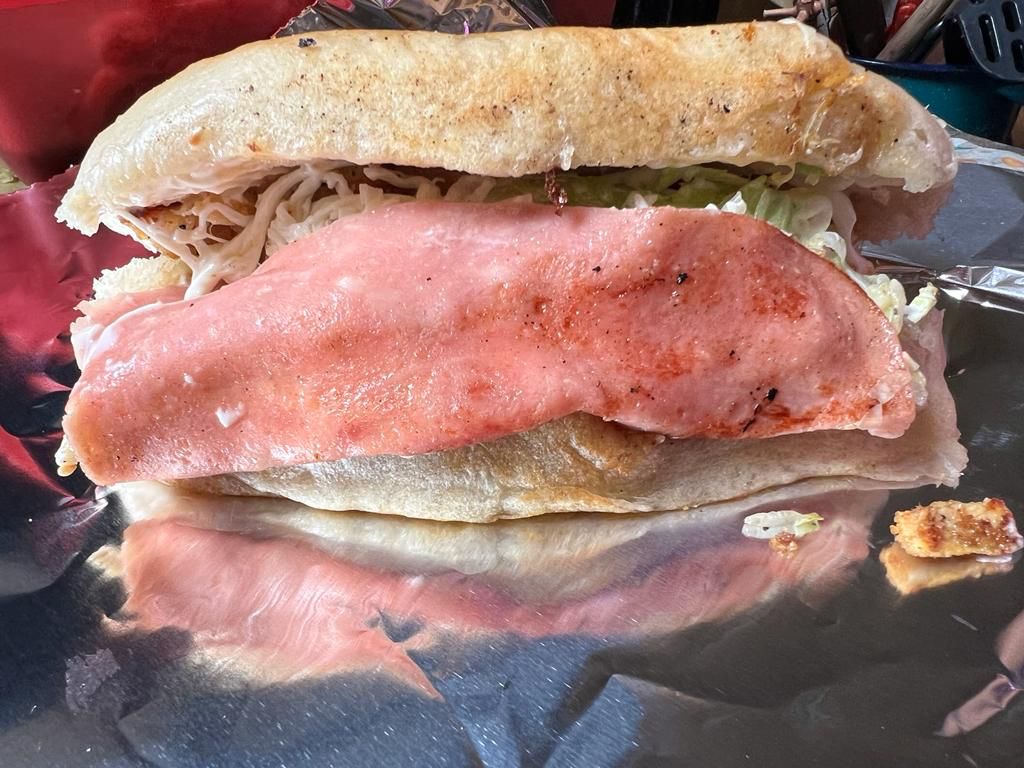 La más grande de nuestras tortas armada de carne asada, pastor, chorizo y extra quesillo fundido, salsa verde, catsup y rajas por aparte.