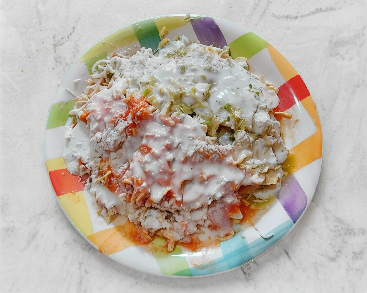 Chilaquilea con salsa de tomate natural, con pollo, quesillo y 100 gramos de carne muy suave asada.