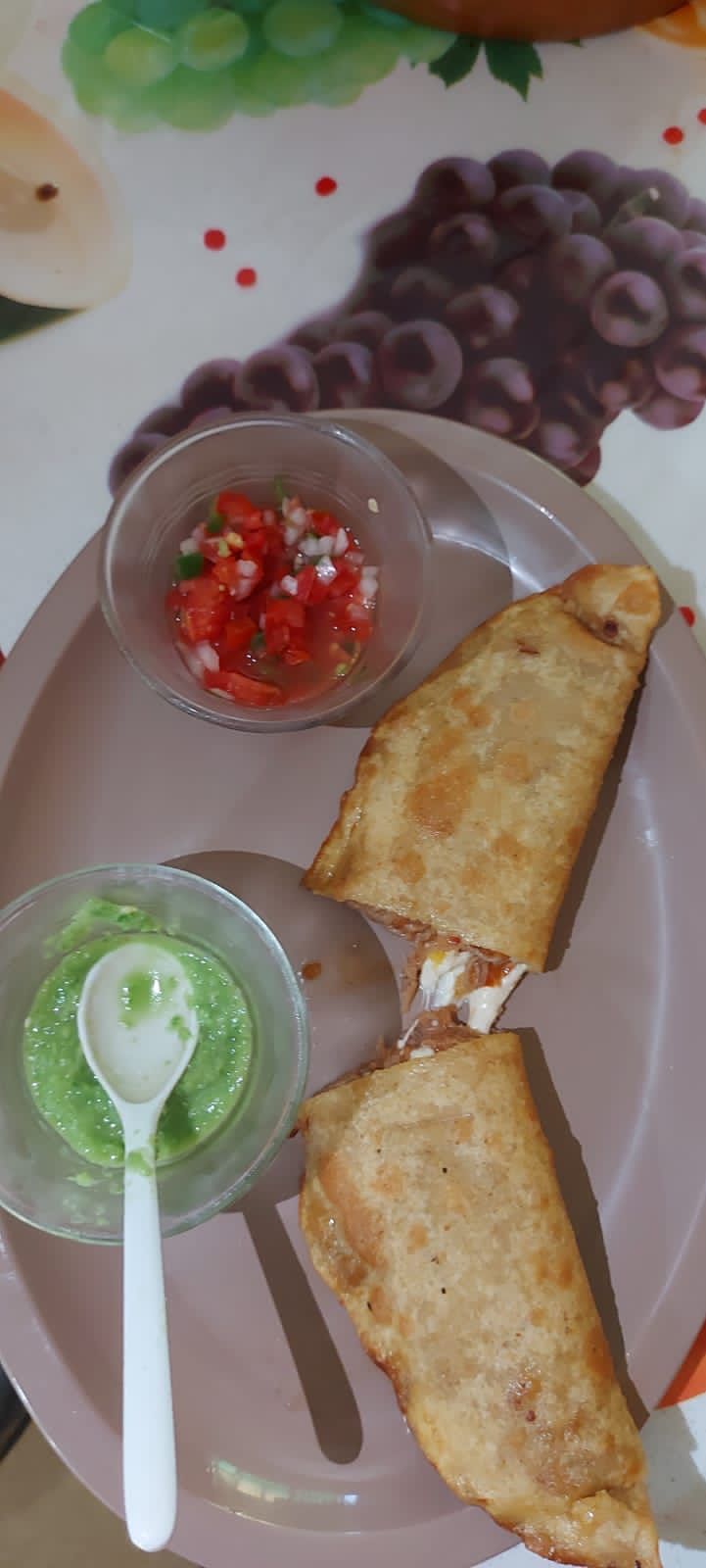Una gran quesadilla de extra quesillo, acompañada de pico de gallo y salsa verde, limón.