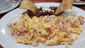 Porción de 3 huevos con jamón y guarniciones de frijol y plátanitos fritos. Incluye tortillas y salsa.