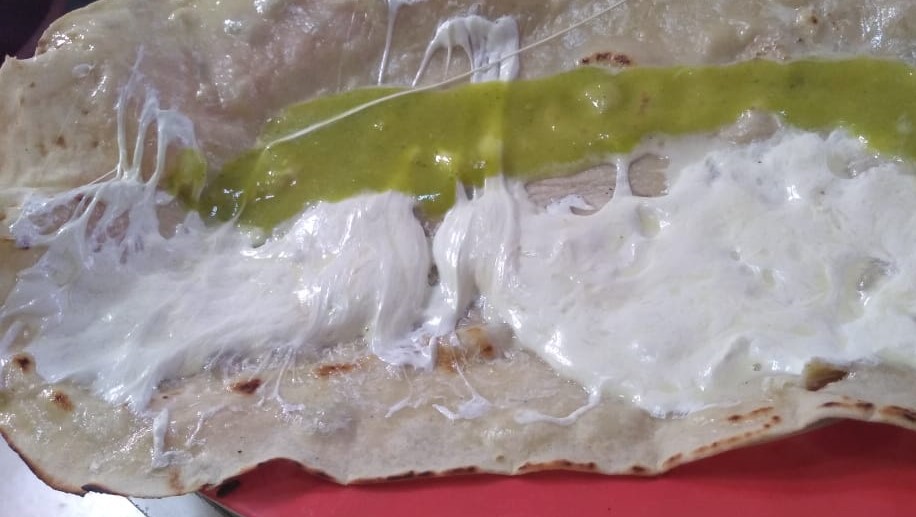 Una grandiosa torta con suficiente carne asada y quesillo fundido lechuga,salsa verde picante y rajas.