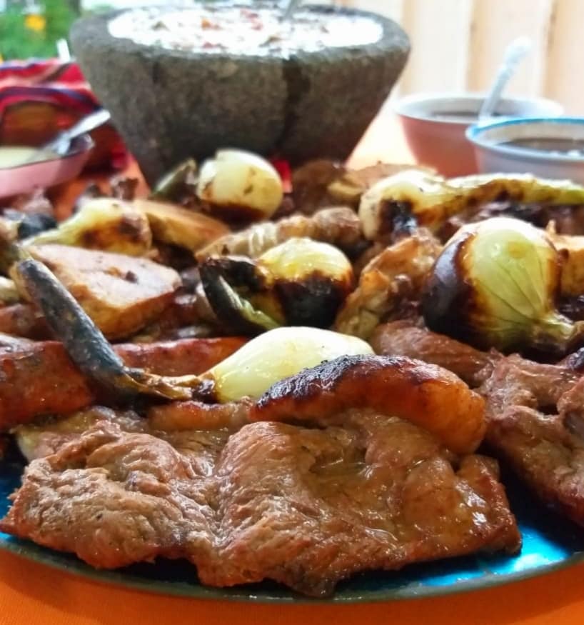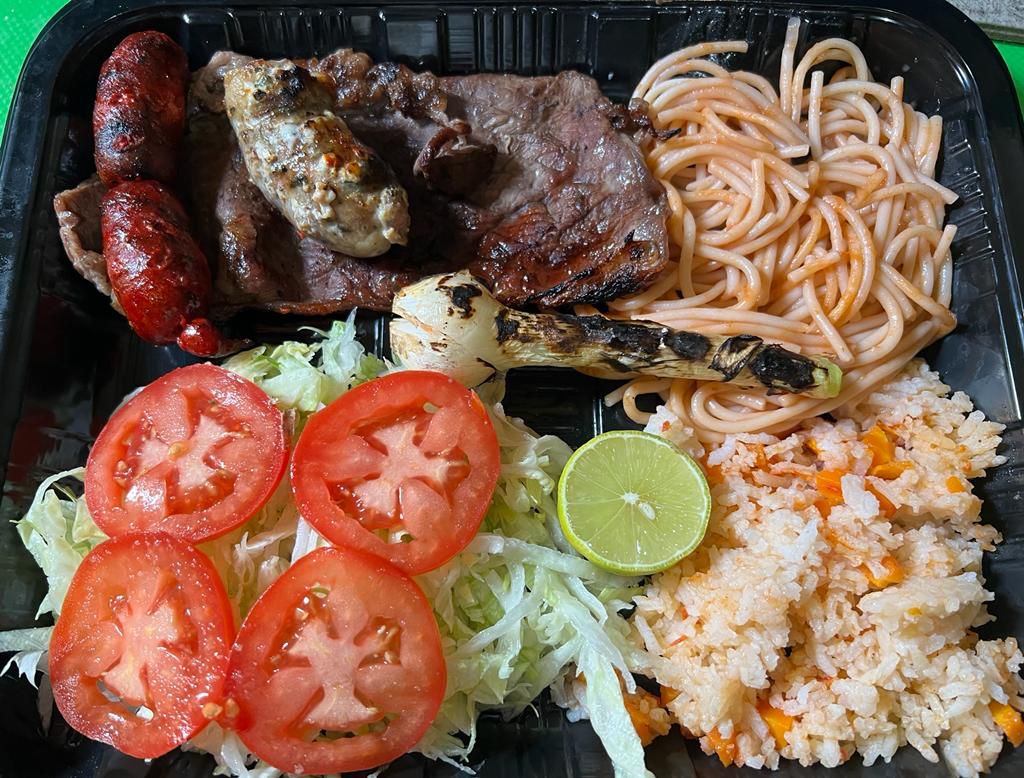 Filete de carne suave 120 gr, dos chorizos, una longaniza, cebollita cambray asada, frijoles, crema, queso, tortillas de mano, salsas verde y pico de gallo y papas fritas.