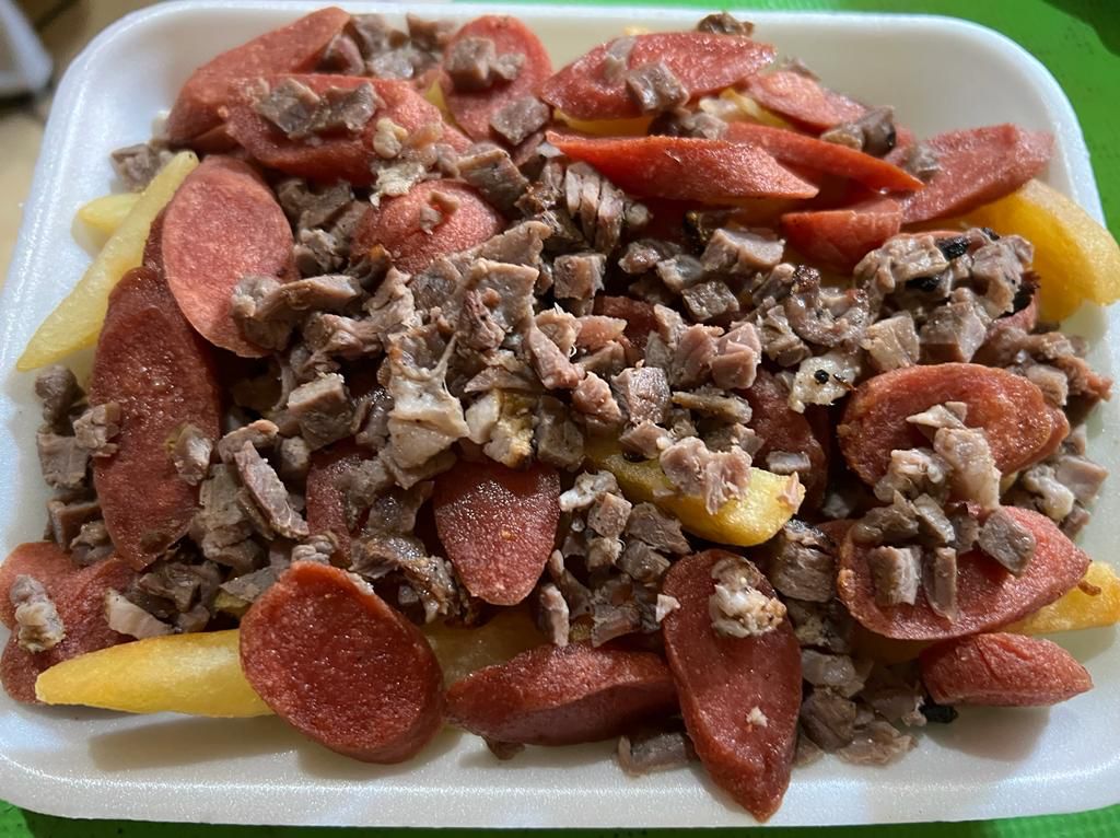 Papas fritas con salchicha en rebanadas, chorizo rebanado y carne asada en trocitos. Incluye rajas, chimichurri y salsa Valentina.