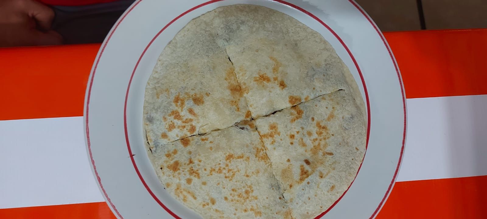 Disfruta de una gran quesadilla de masa de prensa rellena de carne asada con extra quesillo. Adicional pico de gallo, salsa verde y limón.