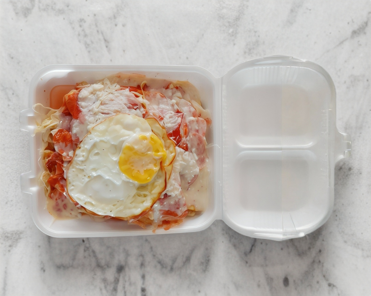 Para desayunar sencillo, porción de 2 huevos revueltos naturales con frijol y dos hotcakes pequeños. Incluye 4 tortillas y servido en desechable económico.