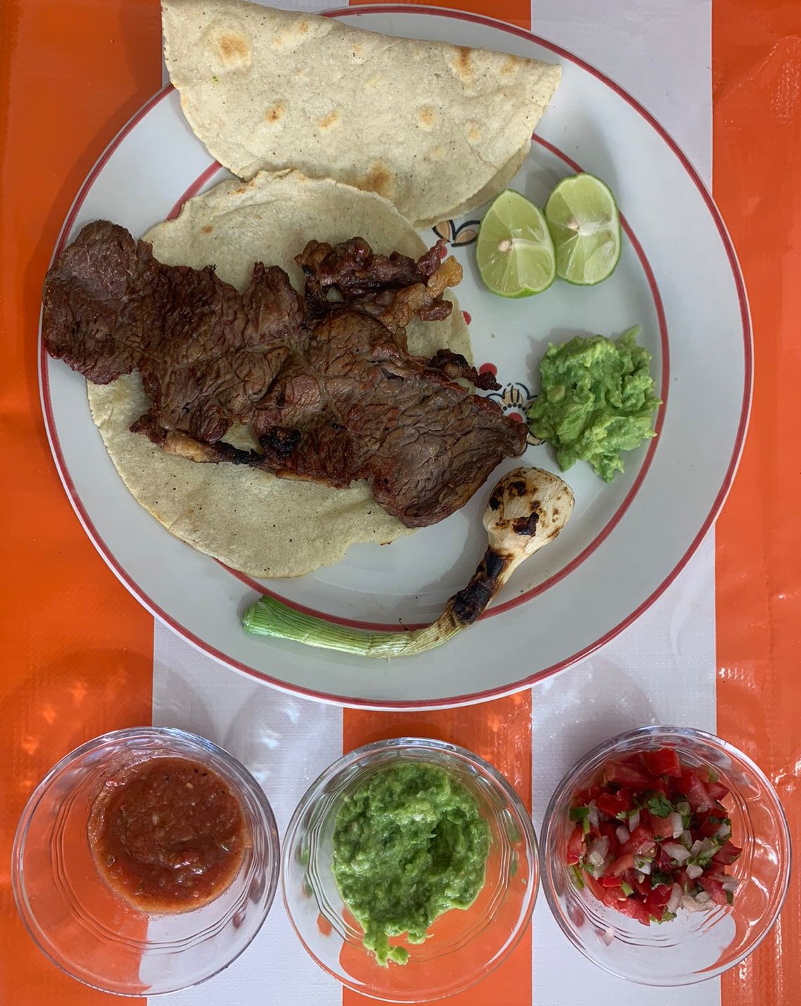 3 tacos (tortilla tamaño normal) de carne asada muy suave. Salsa verde, pico de gallo y limones.