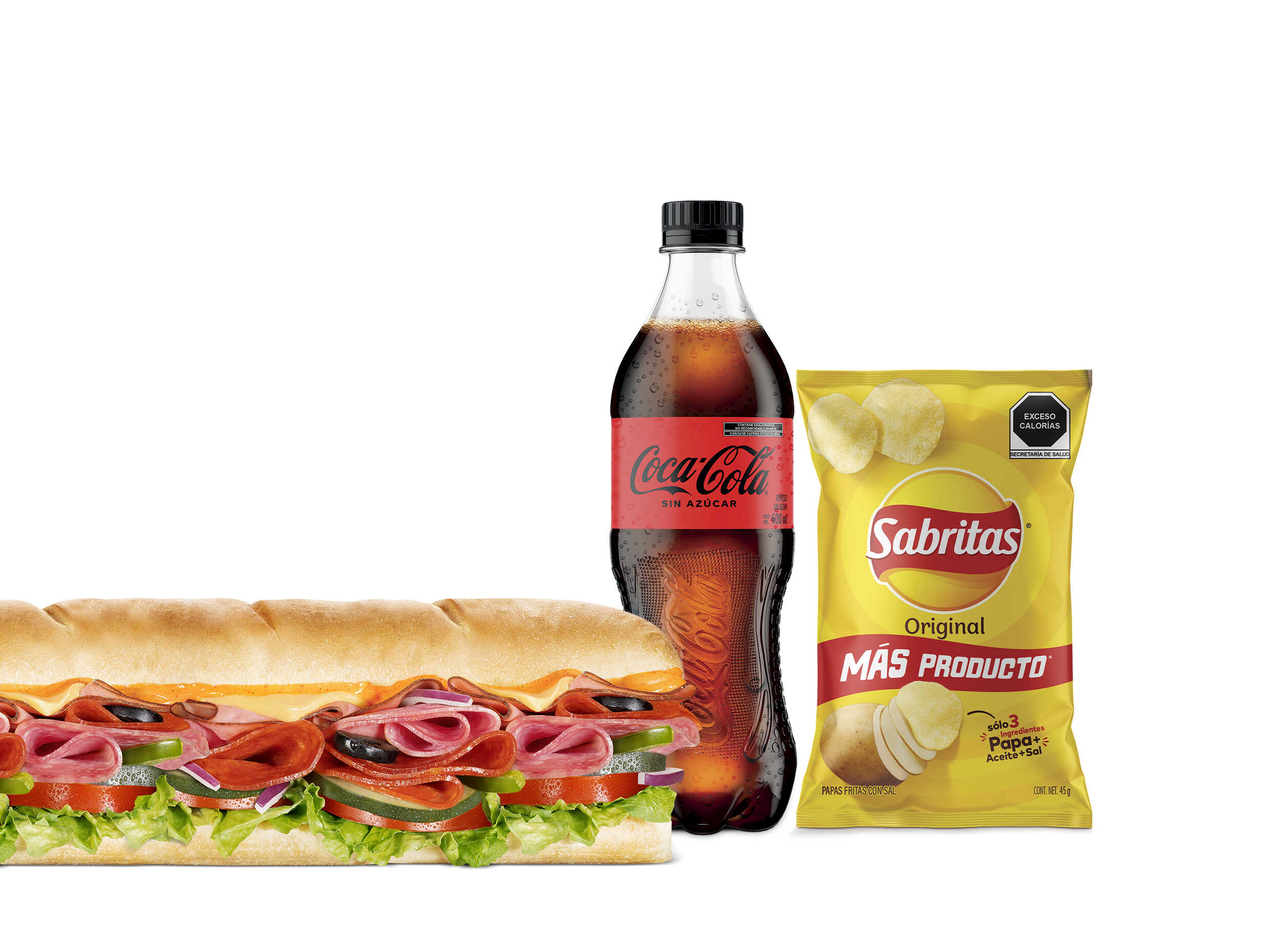 Rebanadas de salami, pepperoni y jamón de cerdo, con el queso y vegetales de tu elección, más papas, galleta y bebida.
