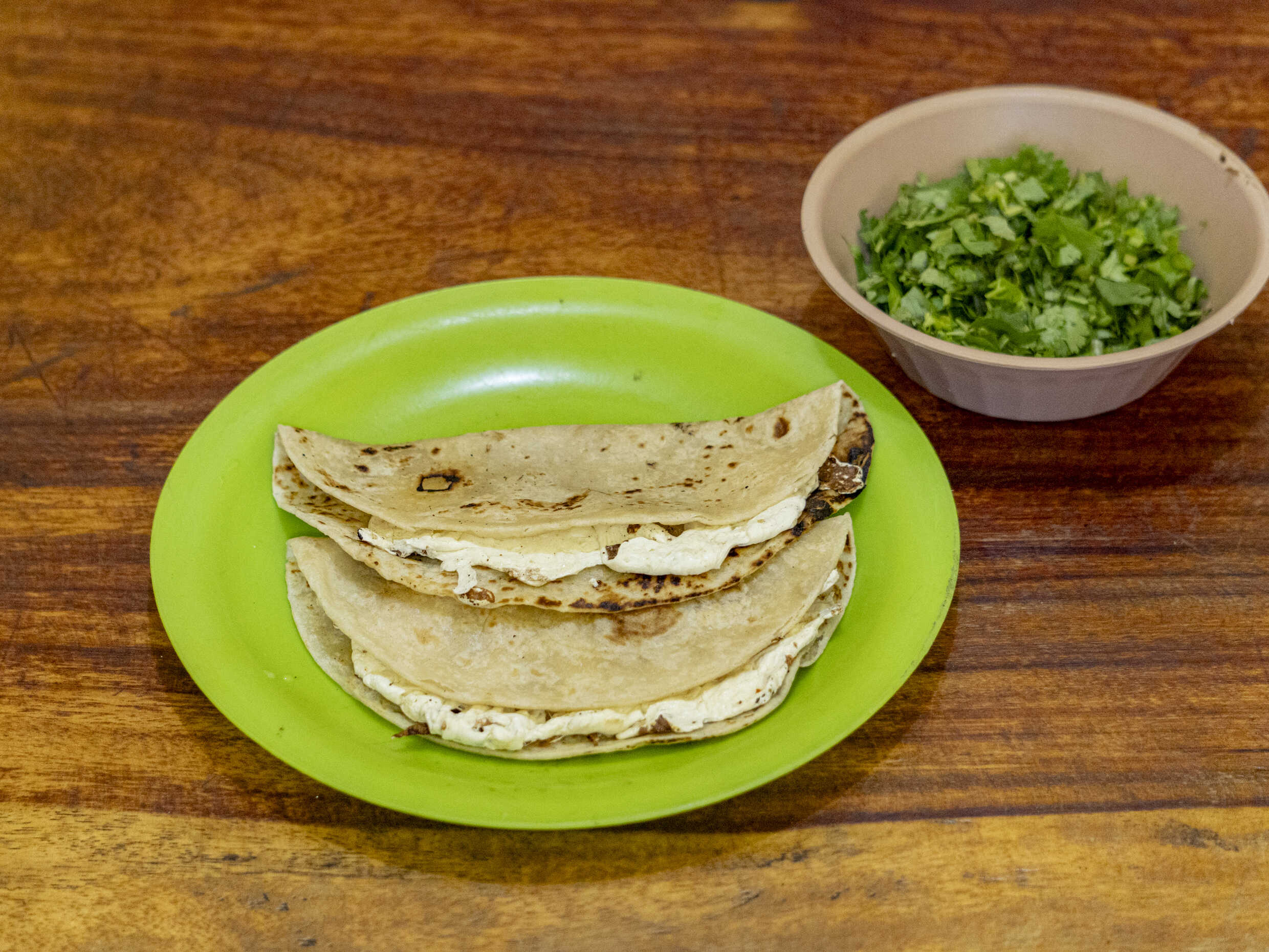 Dos tortillas de harina con mucho queso +salsa tipo guacamole por aparte
