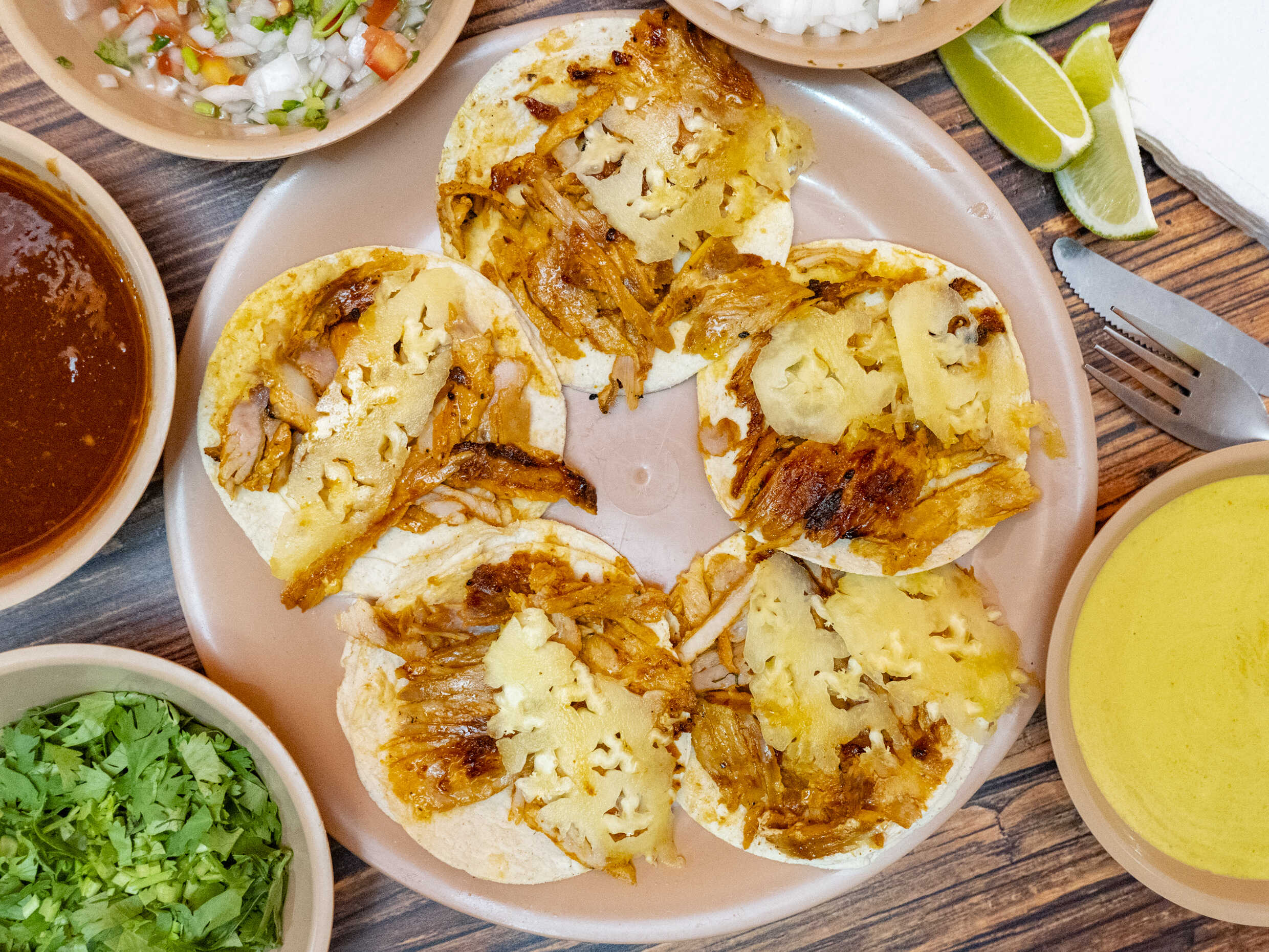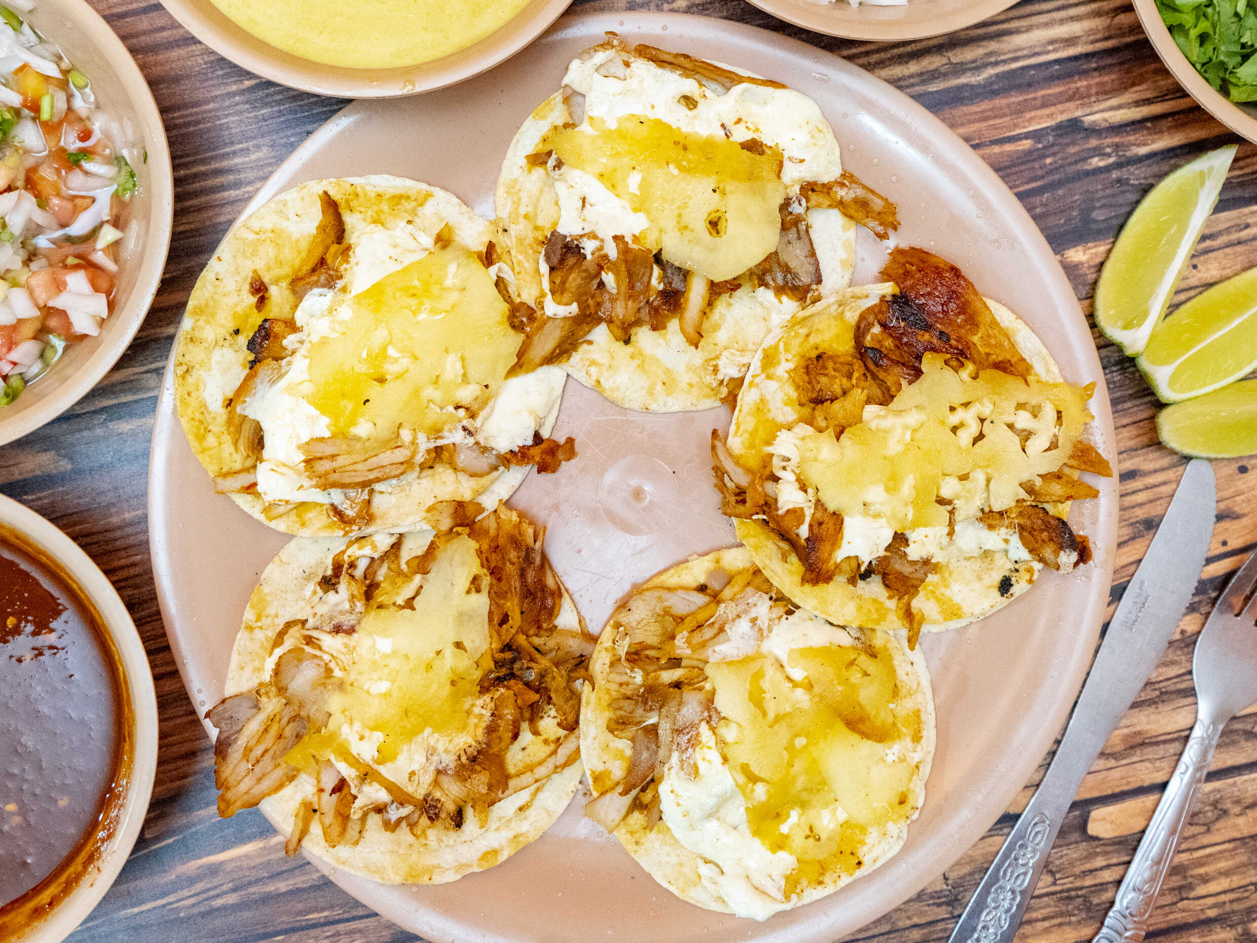 Carne jugosa directo del trompo ,con quesillo ,en tortillas de maíz