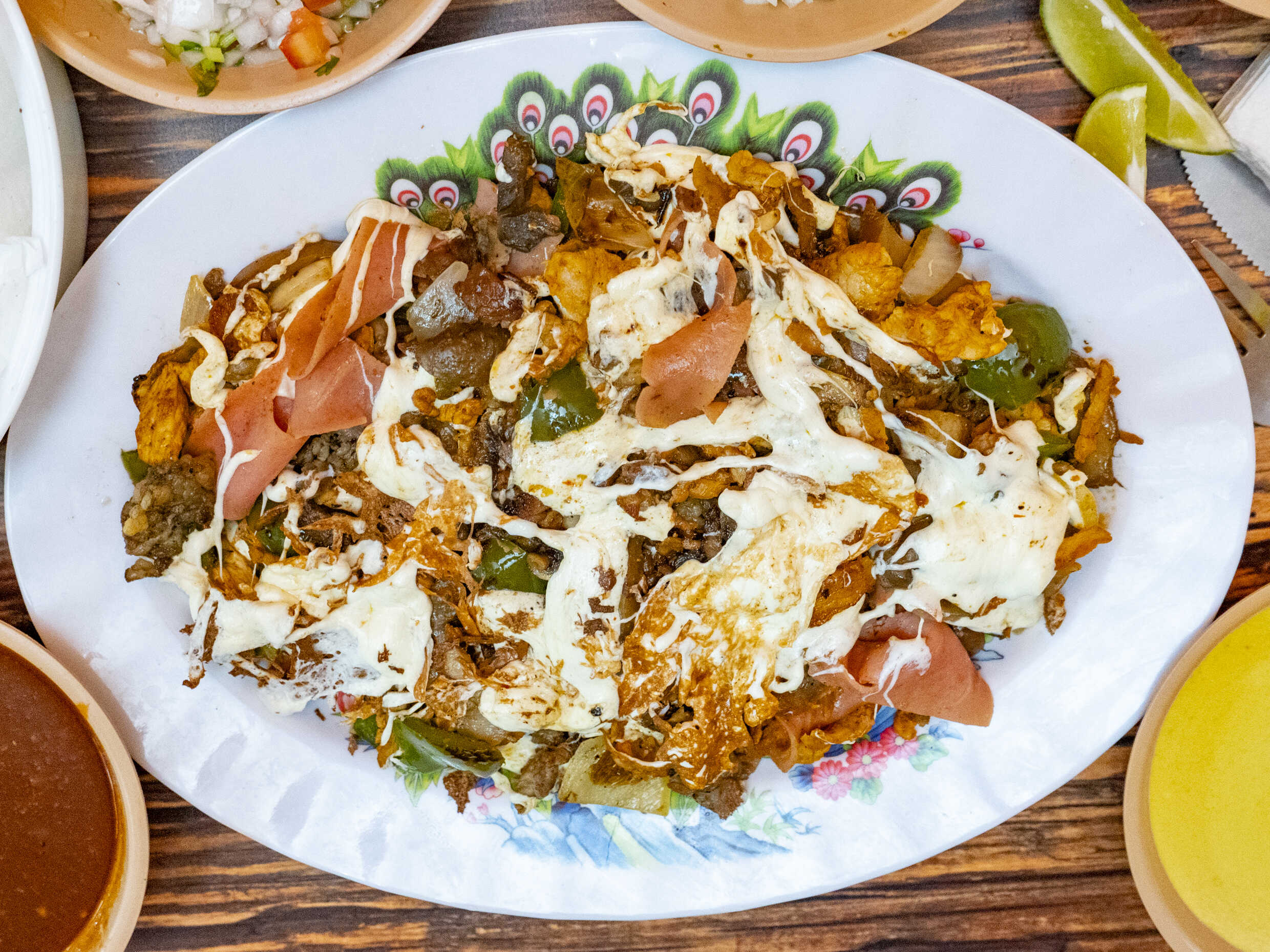 Pimiento morrón, cebolla ,bien eleborado, más carne al pastor suficiente,jamón ,quesillo .platillo para compartir ó para personas de buen comer (18) tortillas ,salsas y limones