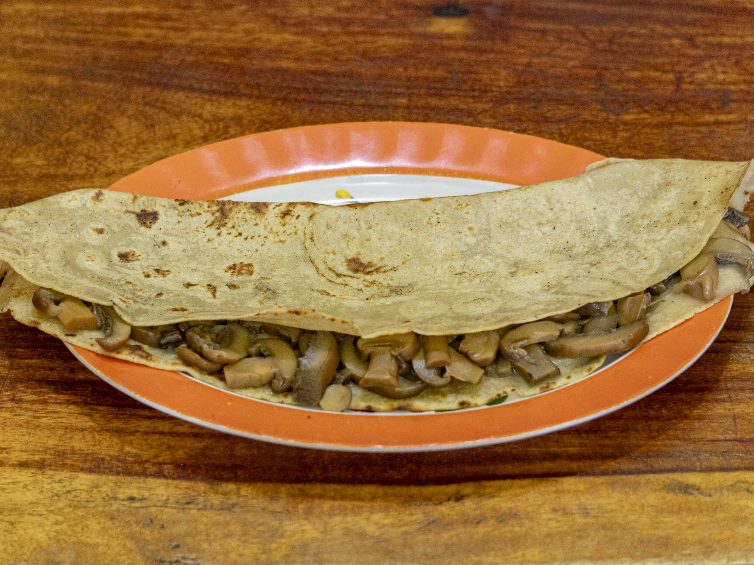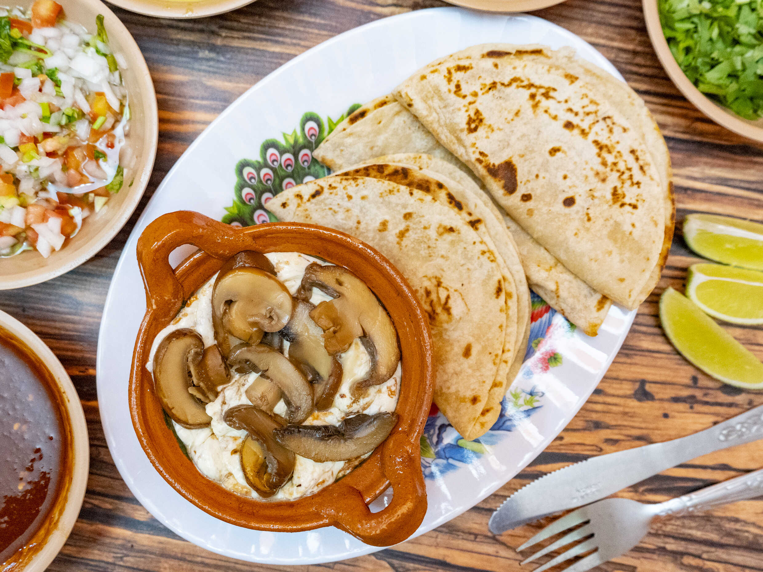 Queso derritido suficiente,(quesillo) + champiñones no guisado, natural,para gustos exigentes+ +tortilla harina (4) maíz (16)