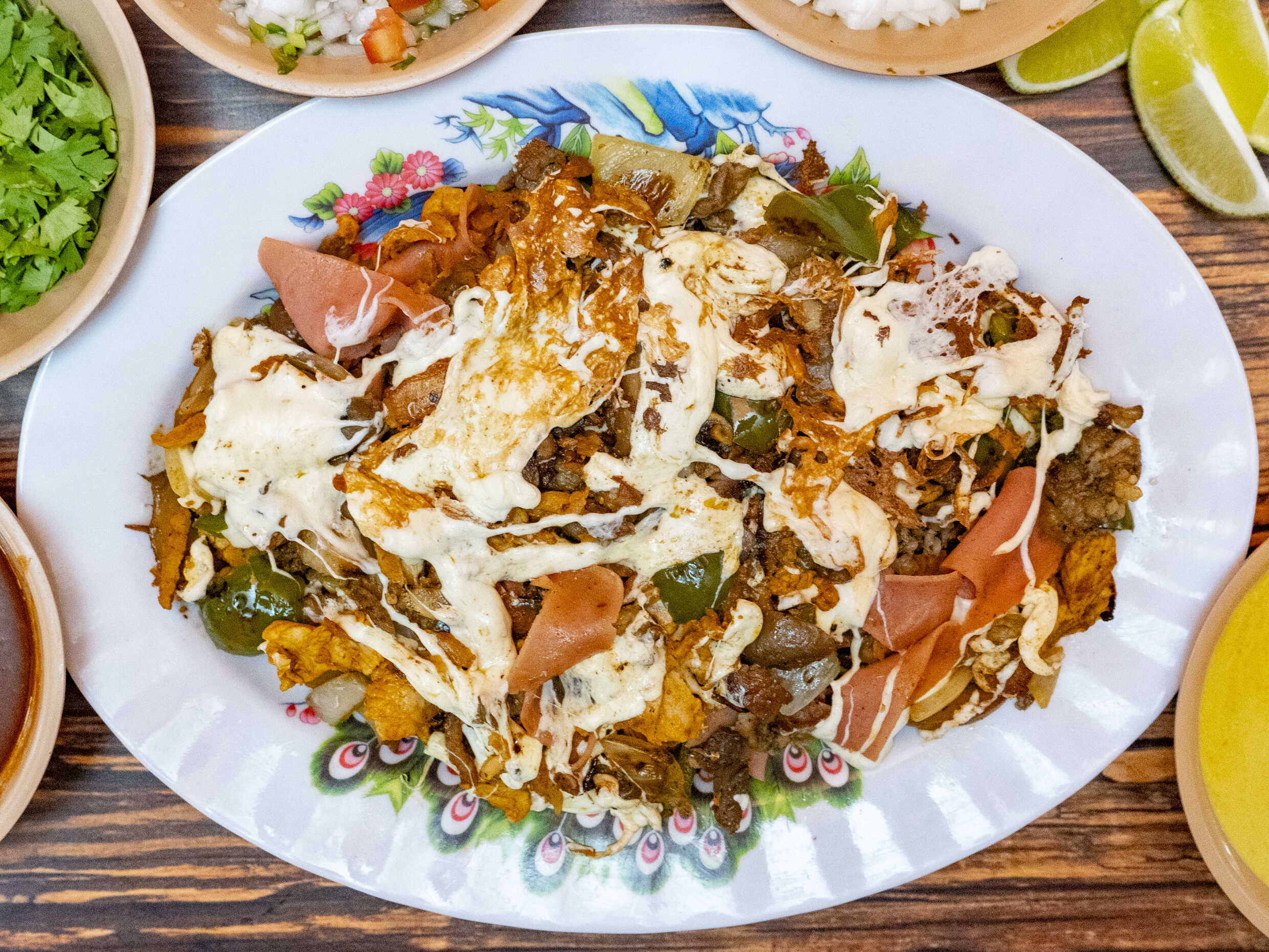 asada, pastor, champiñones, quesillo ,+ salsa tipo guacamole,+cebolla