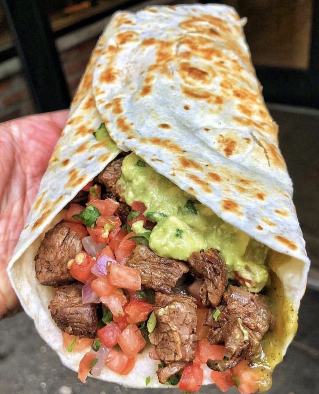 1 burrito de harina partido a la mitad, Carne al pastor , chuleta, chorizo o champiñón, 400 gramos en total, aderezo verde, salsa roja, ensalada de lechuga, jitomate, aguacate