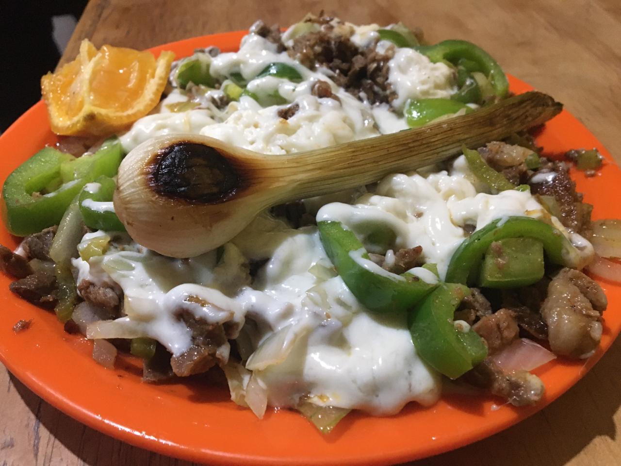 Bistec, pastor, cebolla, morrón y quesillo.